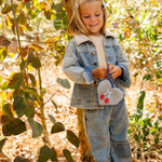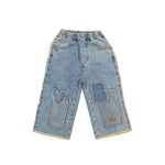 Adorable wide-leg denim pants featuring charming handmade heart patches.