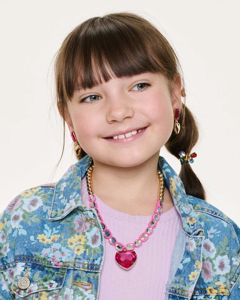 The Perfectly Pink Mega Set is a treasure trove of mix-and-match play jewelry, featuring glossy pink enamel and gemstone pieces with a showstopping oversized fuchsia gemstone heart pendant.
