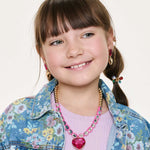 Set includes one stretchy gem-studded necklace with an oversized fuchsia heart pendant, one pair of pink gem clip-on earrings, and two adjustable rings.