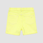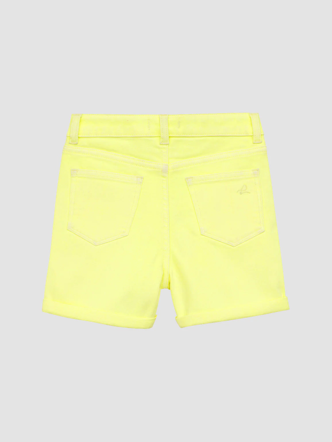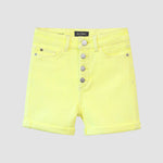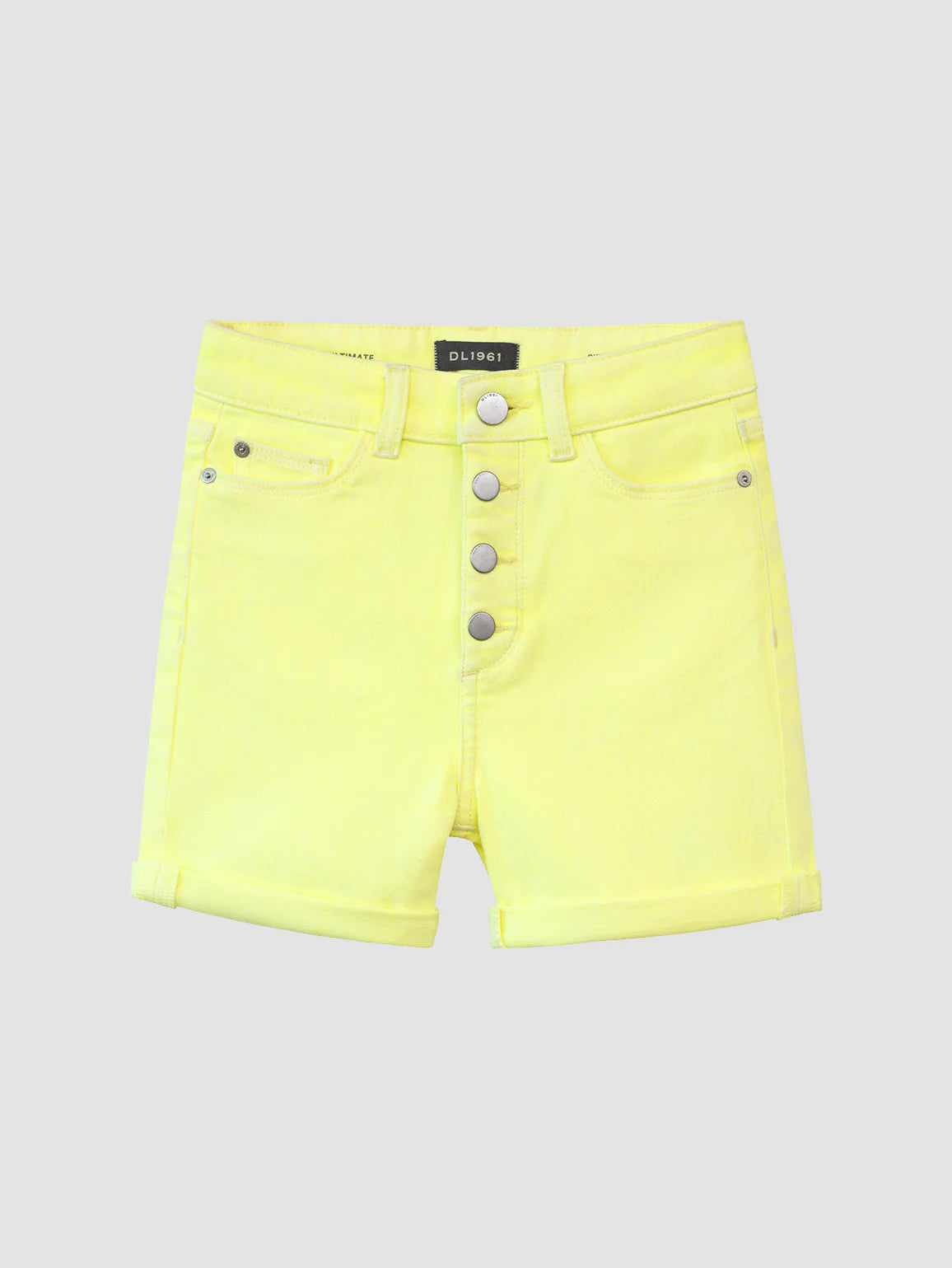 Lemonade is a bright, highlighter yellow garment dye. It features exposed faux buttons that cover a hidden zip fly, tonal stitching, matte silver hardware and a cuffed hem.