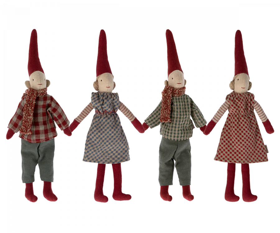 All dressed up in cozy Christmas clothes. They all have magnets in their hands and in left foot so they can climb and decorate everywhere.