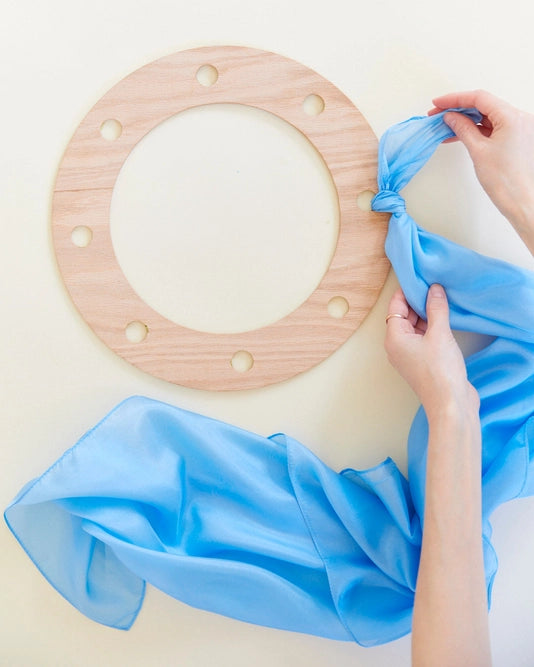 Tie Giants or Playsilks through the ring holes and hang from a branch of a tree or simply let children hold onto the Playsilks and dance around in a circle. Also wonderful as a canopy over a bed, or a beautiful display in the home.