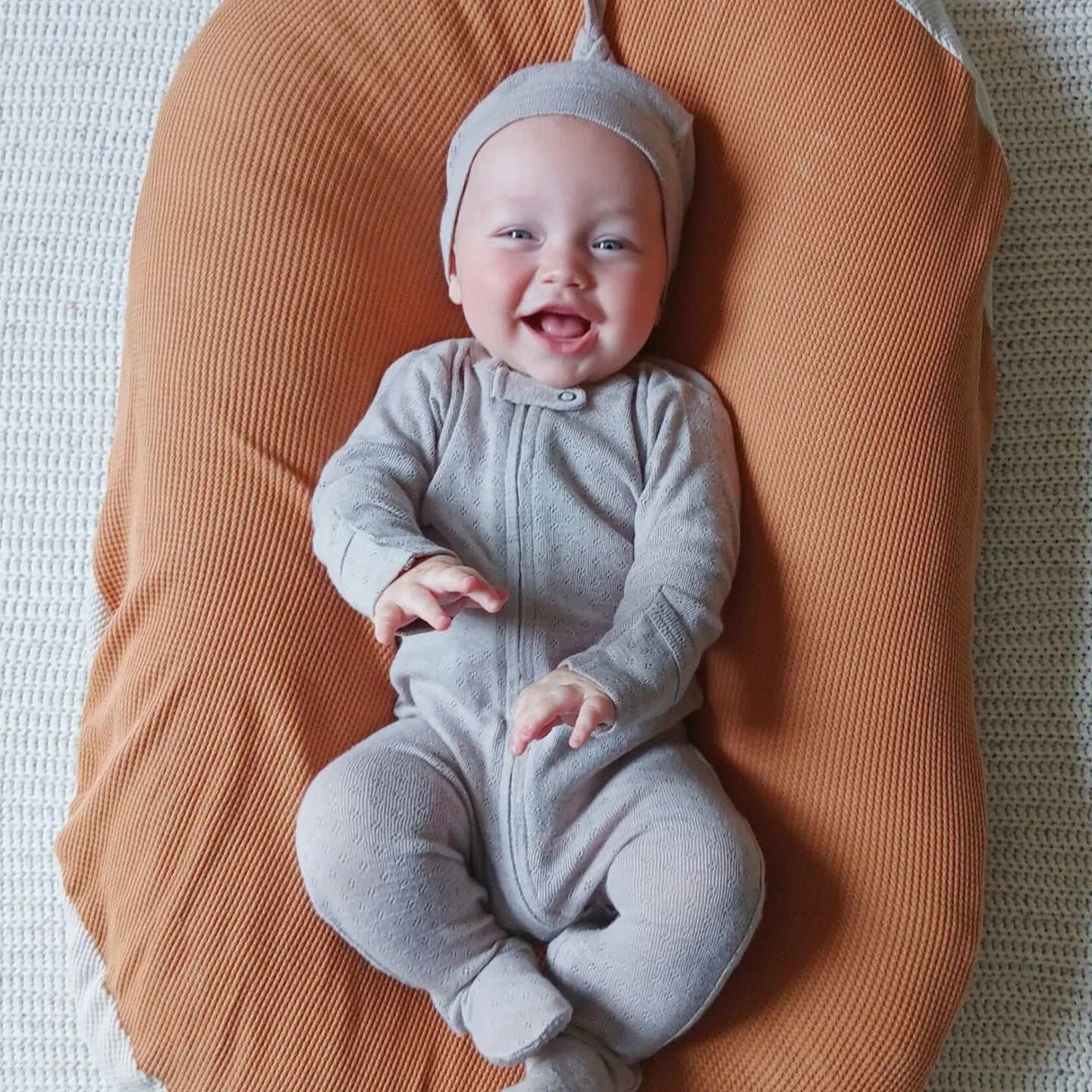 Buttery-soft heathered pointelle fabric with a delicate unisex texture.
