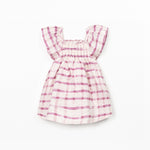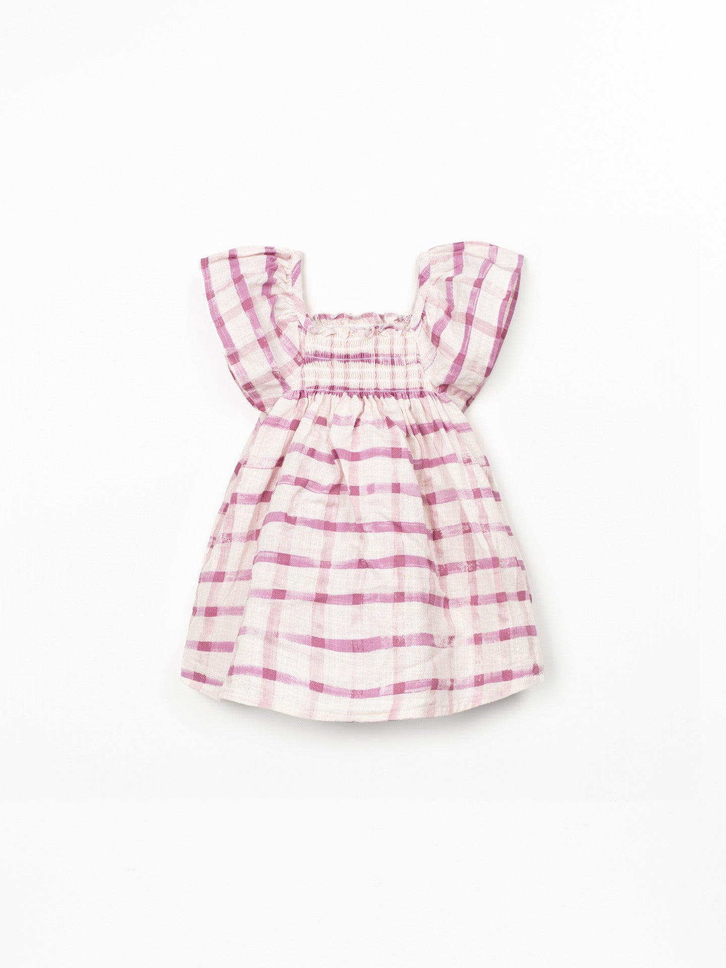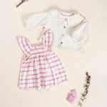 This dress is made of organic cotton fabric, in the color Raw. It features gathered sleeves, a straight neckline, elastic at the chest, and our plaid print.