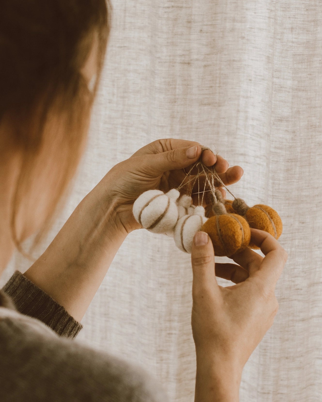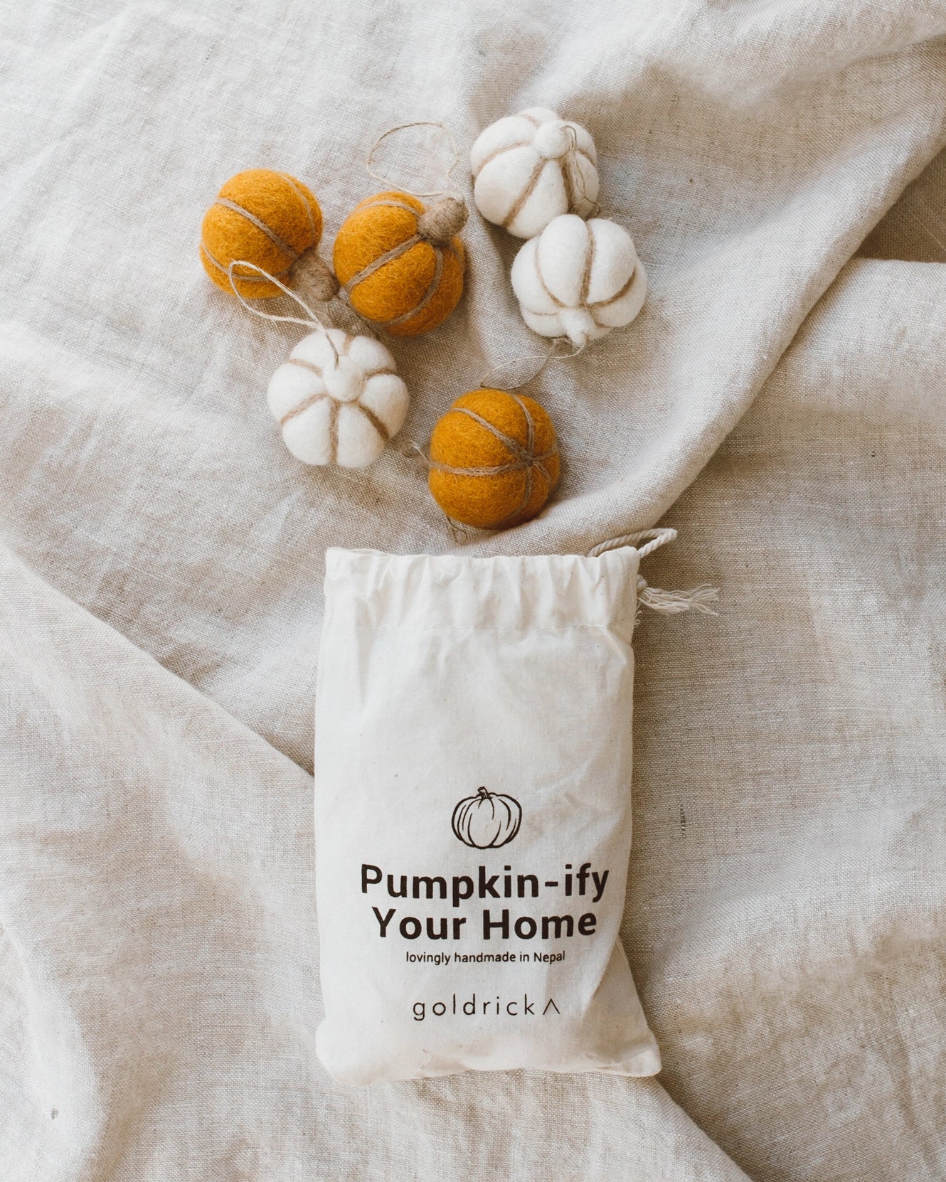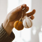 Set of 6 hanging felt wool pumpkins (3 white and 3 orange).
