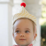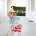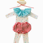 The soft, all-cotton base is patterned with bright rainbow stars, layered with red-and-white striped bloomers for a touch of vintage charm. A soft blue ruffle collar frames the neckline, while a yellow striped linen hat topped with a jaunty red pompom completes the look.