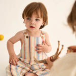 Baby and toddler striped overalls made from soft, comfortable cotton. They feature X-shaped adjustable straps at the back that tie at the front with buttons, patch pockets on the legs with horizontal stripes, snap buttons along the legs, and elastic at the back and hems for a snug, comfortable fit.