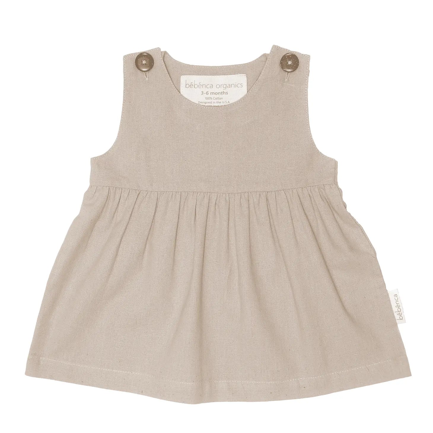 Made from recycled cotton, this dress for babies has been dyed with natural organic dyes found in nature. No synthetic chemicals were added. the buttons are made from coconut shells. Designed for easy changes. perfect for summer but can also be worn with a top and layers during colder days. The color and style make this dress a great all-season baby wear.