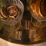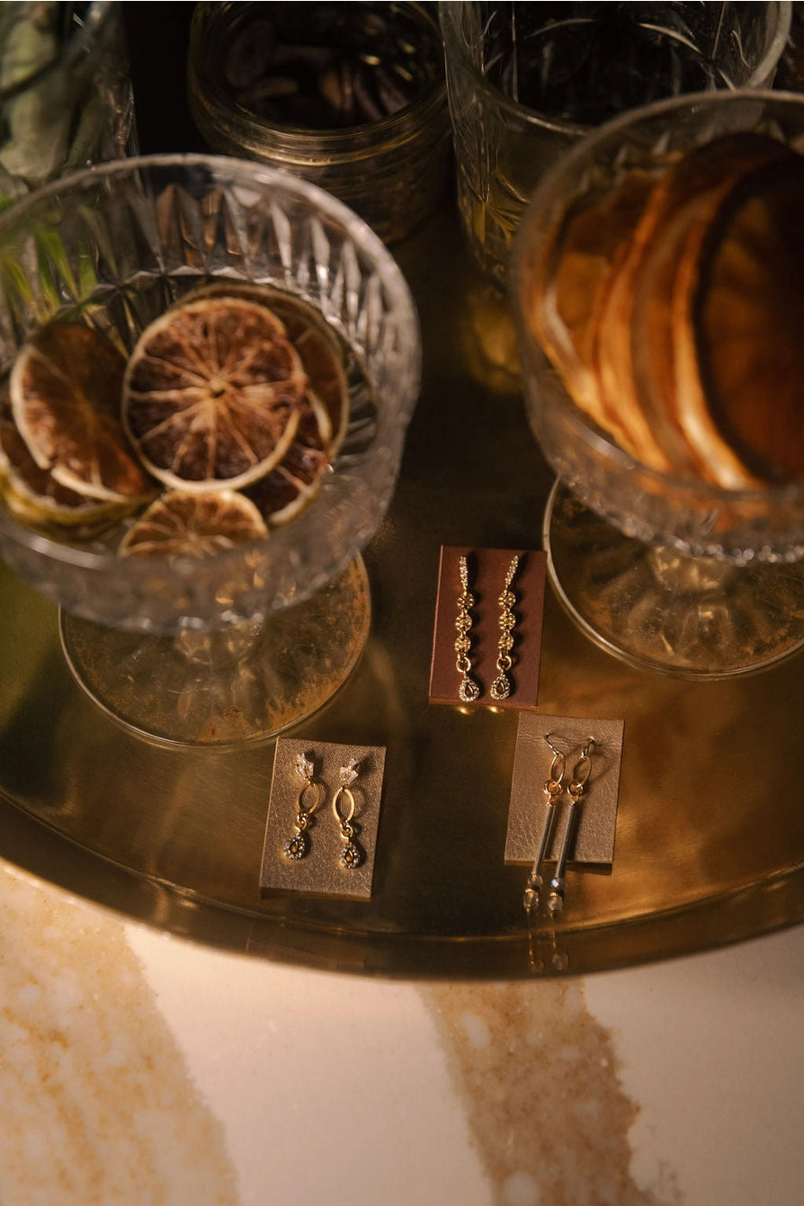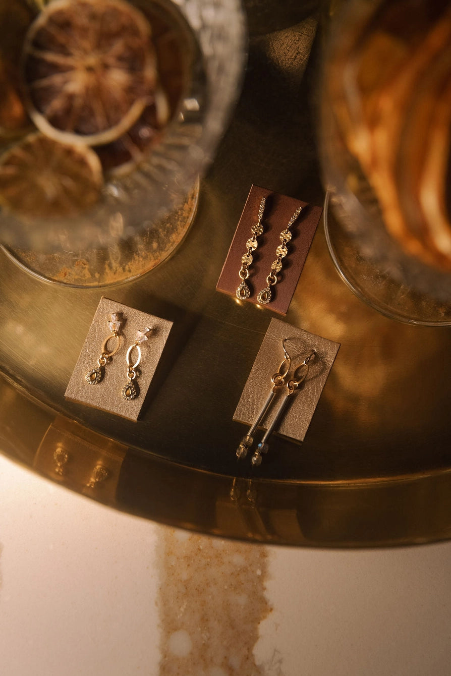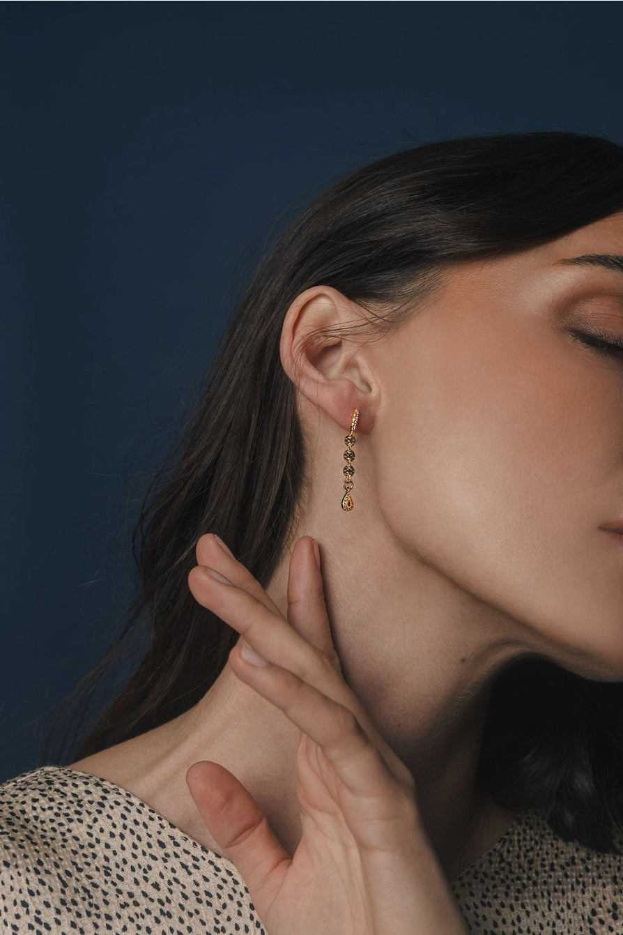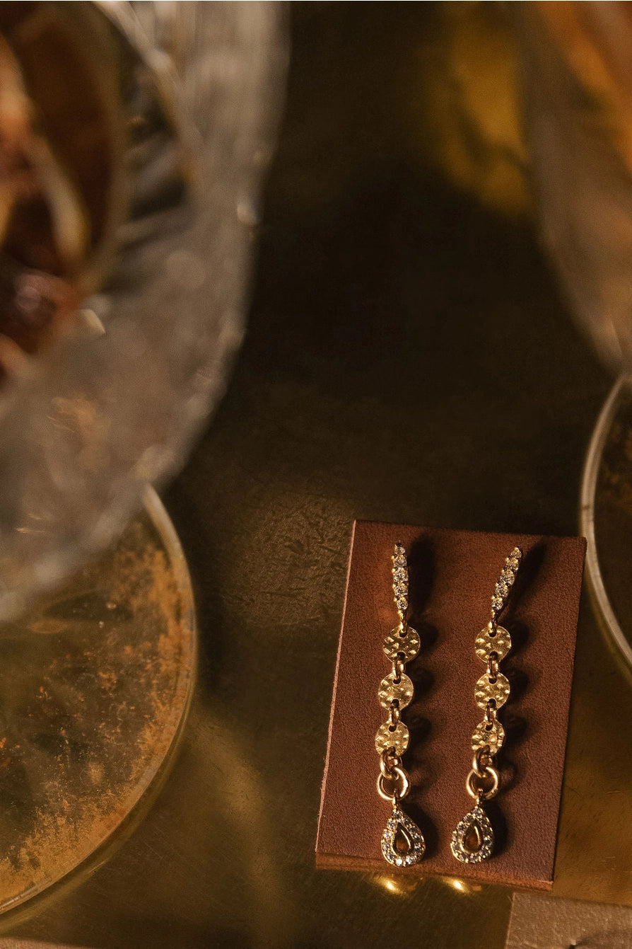 Adorn your ears with gold coin chain and sparkling cubic zirconia gems and feel the enchantment of an ancient world.