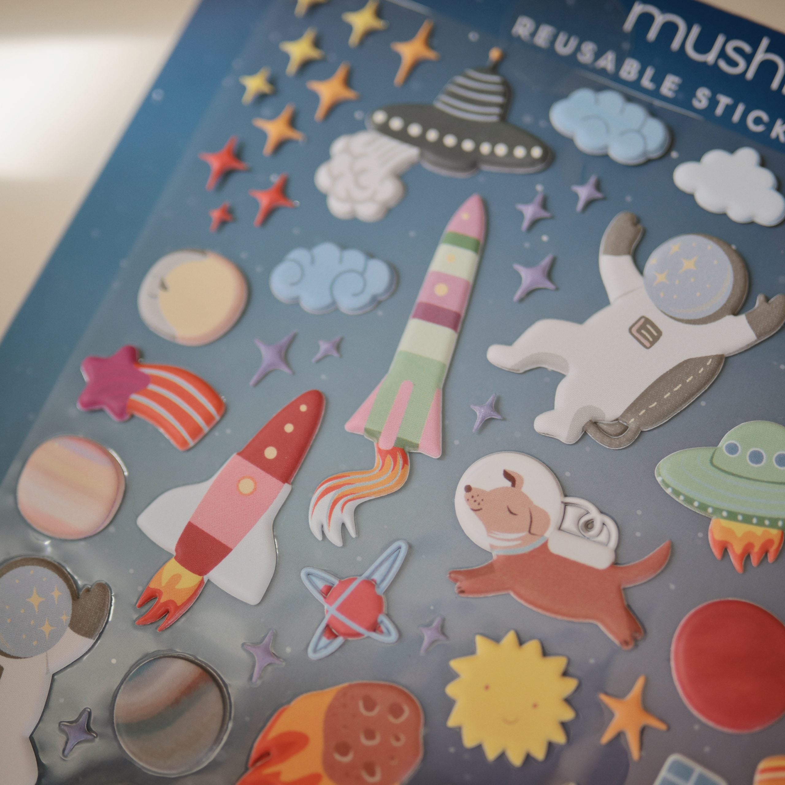 Set the stage for imaginative storytelling with a reusable sticker book that features space themes and galactic scenes. With puffy stickers that can be used over and over again, little astronauts will enjoy pretend play with 3-2-1 countdowns and rocket ship blast-offs. The simple carrying handles let you take playtime anywhere with easy-to-hold cutouts at the top of the book. Watch littles act out countless scenarios as they move stickers around the book and explore the stars, planets and universe.