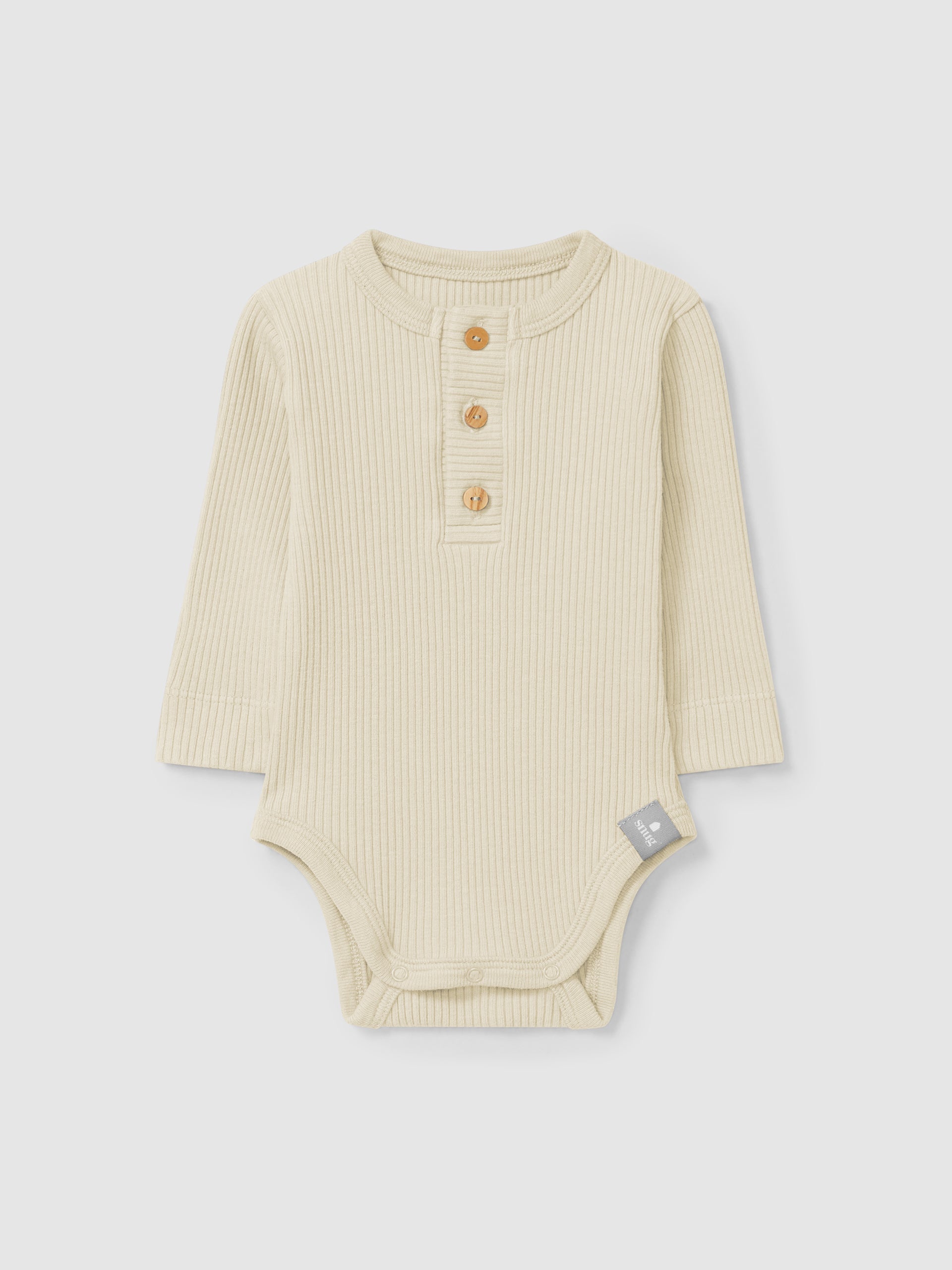 Fastens with wooden buttons on the front and poppers between the legs.