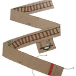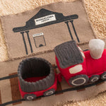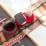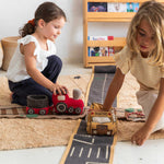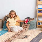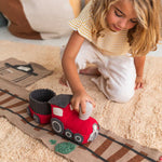 Choo choo, all aboard the train! Next stop: Barcelona. The Ride & Roll Train is a handcrafted textile toy made from scraps from our own factory and consists of a soft toy train made in red that comes rolled up in a 4 meter long canvas road with printed train tracks, level crossing barriers in red and white, and a train station.