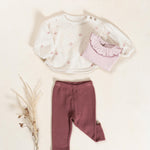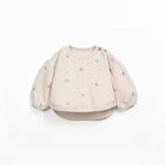 It features long sleeves, a round neckline, shoulder opening with two coconut buttons, and our flower print.
