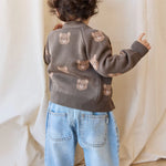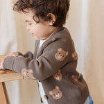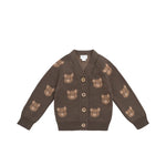 A timeless knit with a touch of whimsy, the Samuel Cardigan in Bobbie Bear Canteen is crafted from 100% cotton and features a charming bear face pattern throughout.