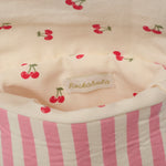 Our sweet cherry kiss scallop bag is made in our signature pink candy stripe fabric and features an embroidered cherry motif.