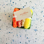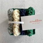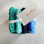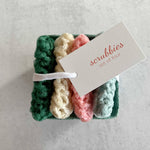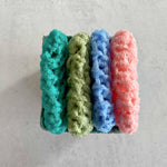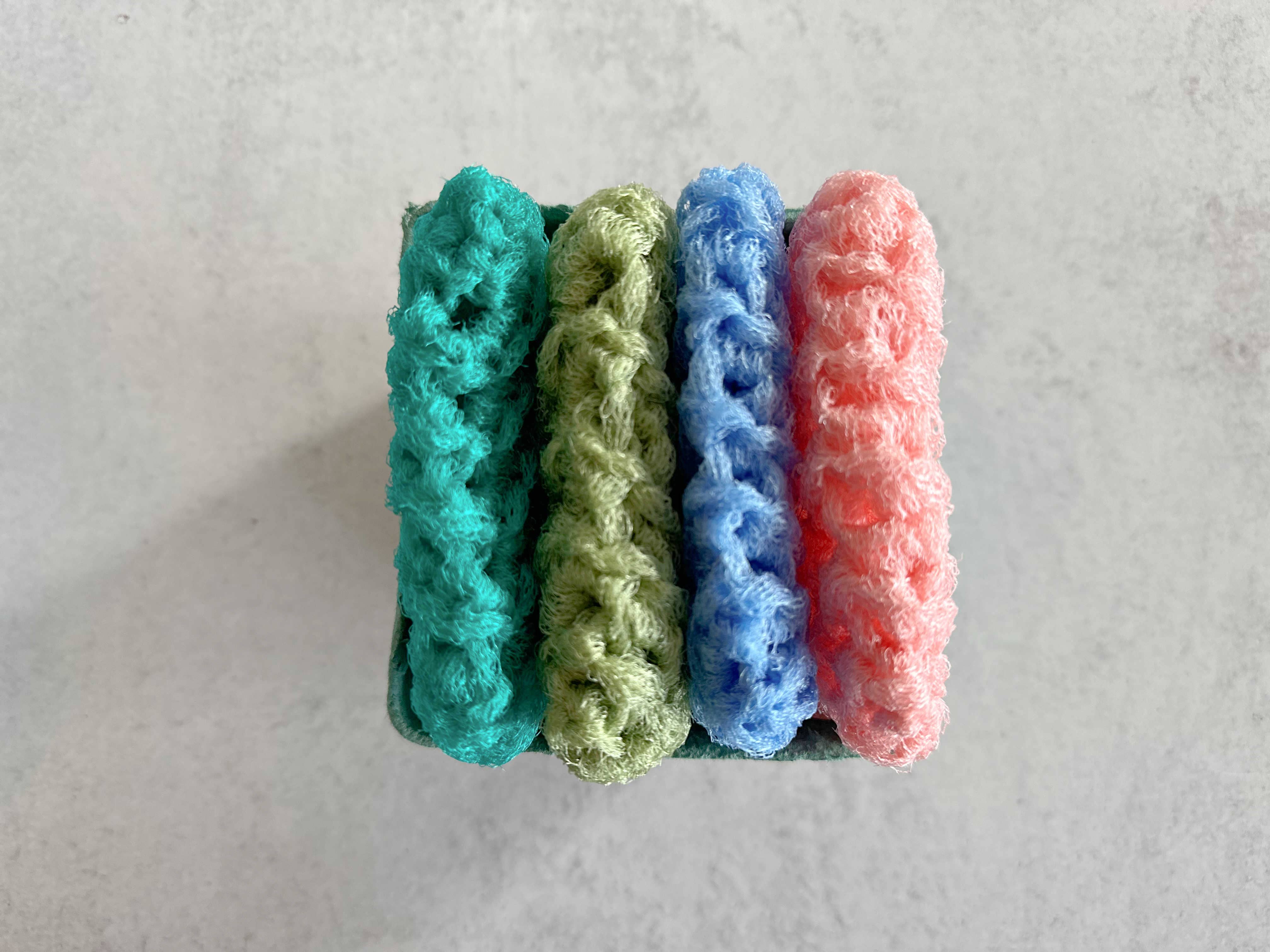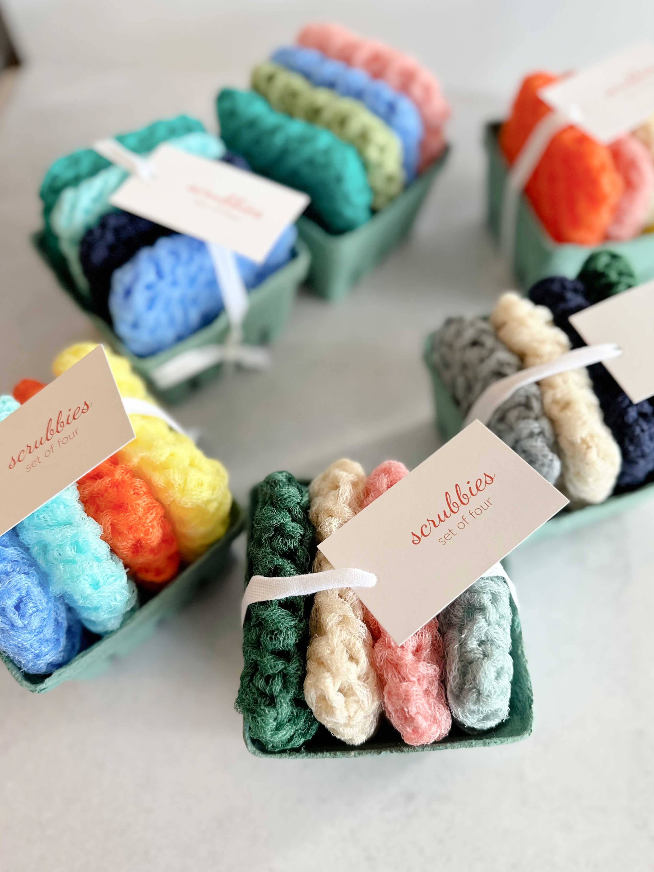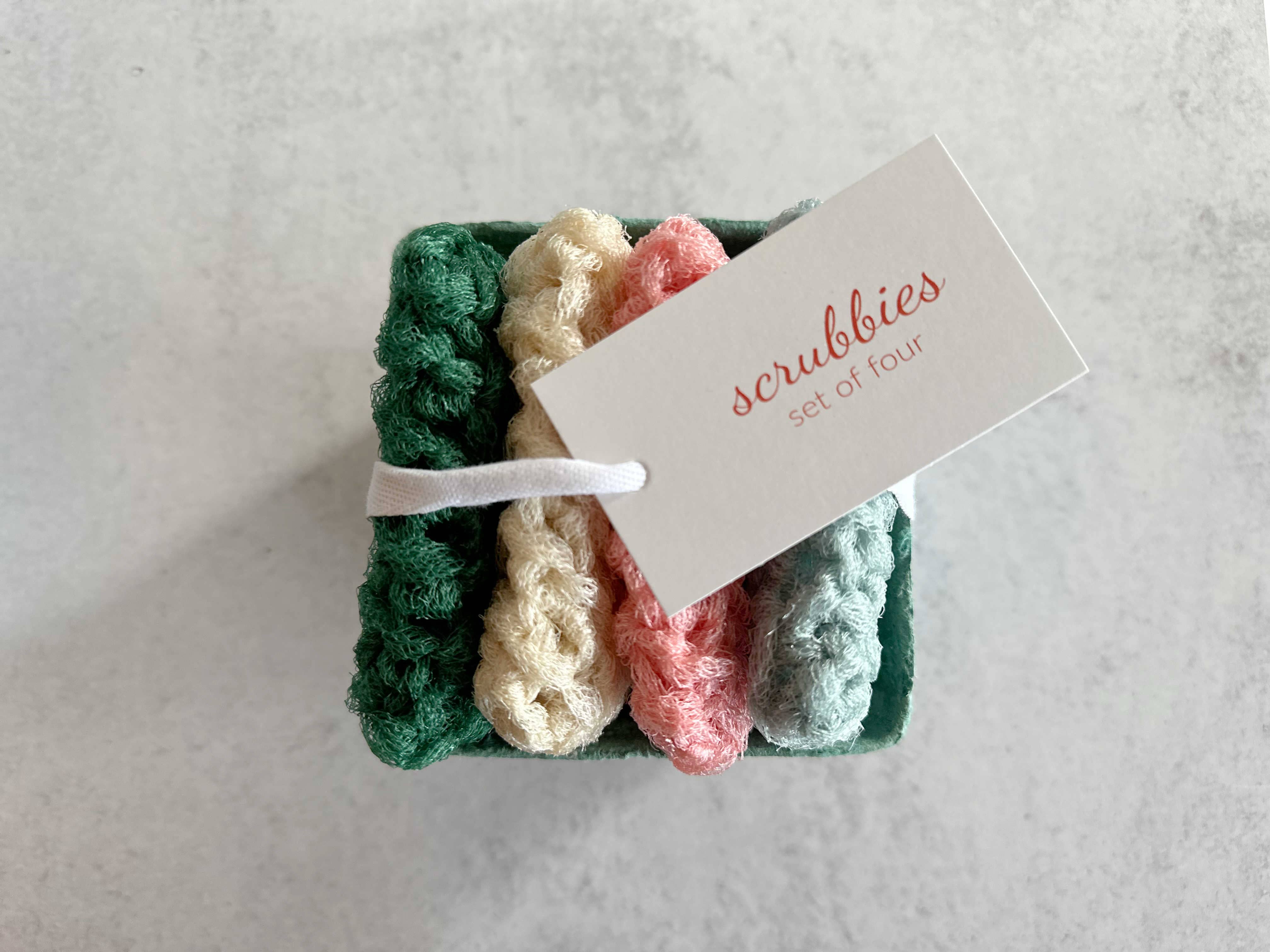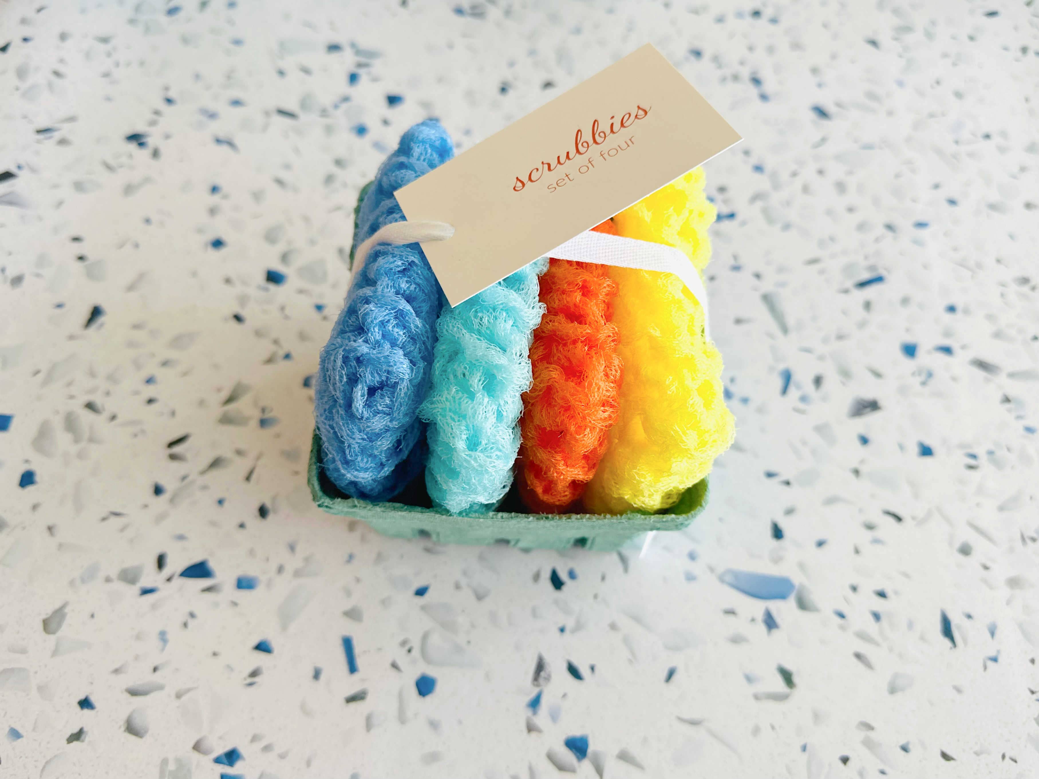 Four of our favorite, handmade scrubbies in a thick paper (recyclable) berry basket.