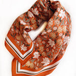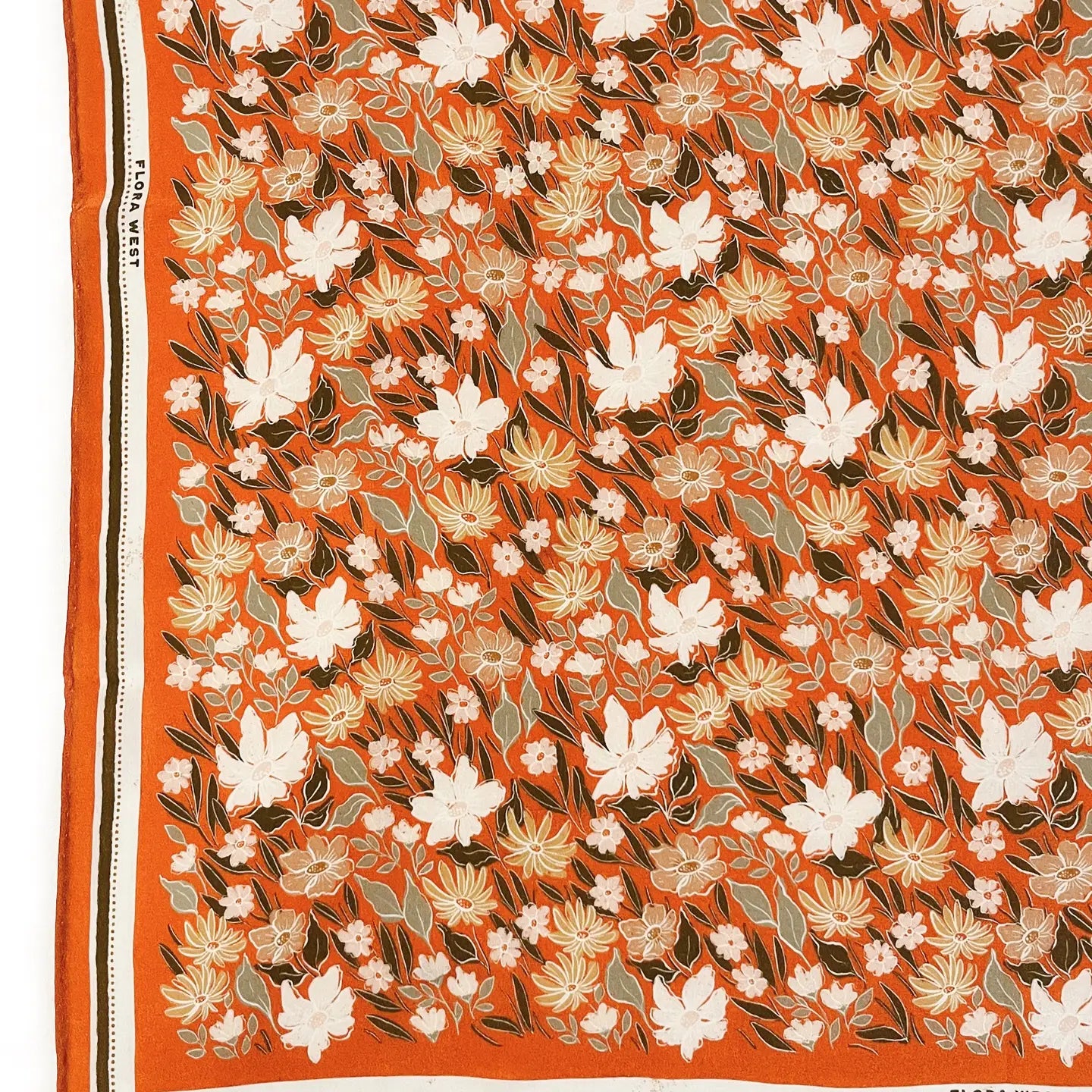 These silks are created from hand illustrated Flora West designs. Botanical Garden is a colorful floral pattern that pops on its bright orange background. The design is digitally printed onto the silk, and finished off with an invisible hand rolled edge seam.