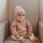 What a fun sweater for your little aspiring skier! Hand-knit in chunky yarn, this crew neck sweater in Rosy pink says 'ski bum' across the front in natural yarn. Hand knit, it is soft and warm. This is such a great sweater, perfect for any little girl. Make sure you buy the matching Ski Bum Hat to go with this.