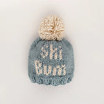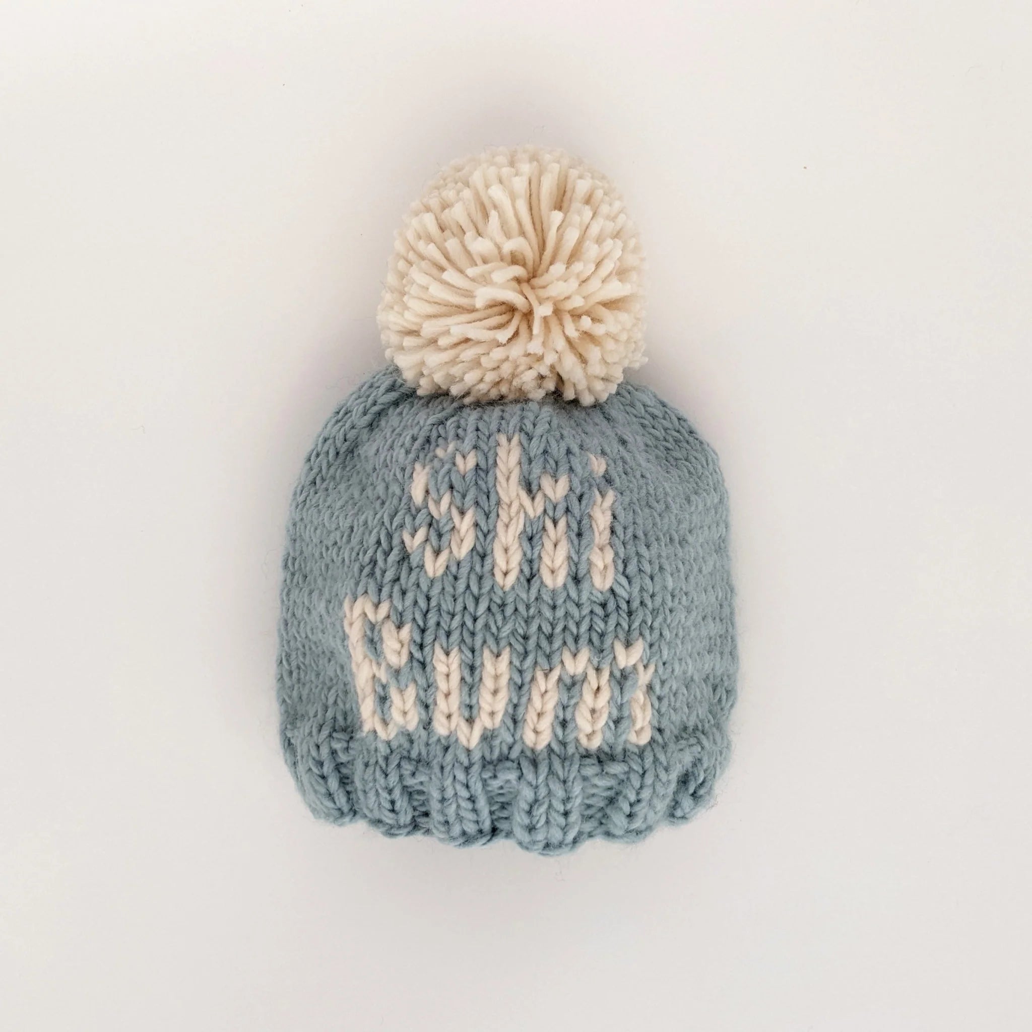 What a cute way to hit the ski slopes! This beanie is hand knit in cozy surf blue hued yarn with the words 'Ski Bum' in Natural colored yarn. Topped with a natural yarn pom pom, this looks great with everything and is a fun gender neutral baby gift. Match it with our coordinating Ski Bum Sweater for the cutest look ever!