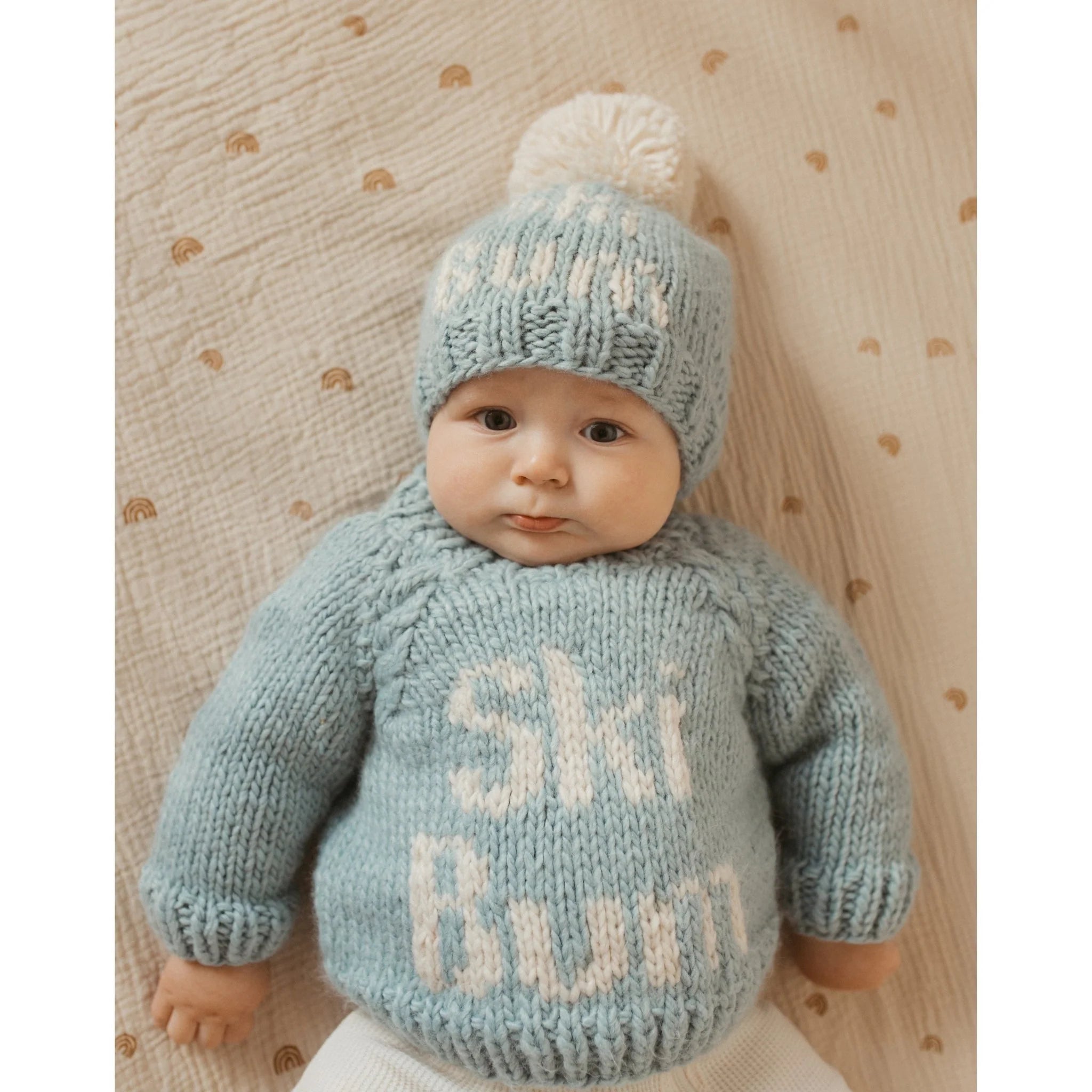 What a fun sweater for your little aspiring skier! Hand-knit in chunky yarn, this crew neck sweater in surf blue says 'ski bum' across the front in natural yarn. Hand knit, it is soft and warm. This is such a great sweater, perfect for any little one. Make sure you buy the matching ski bum hat to go with this.