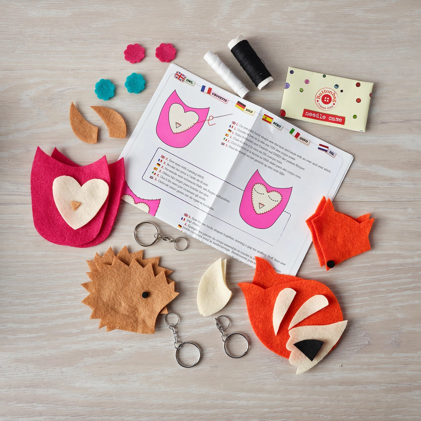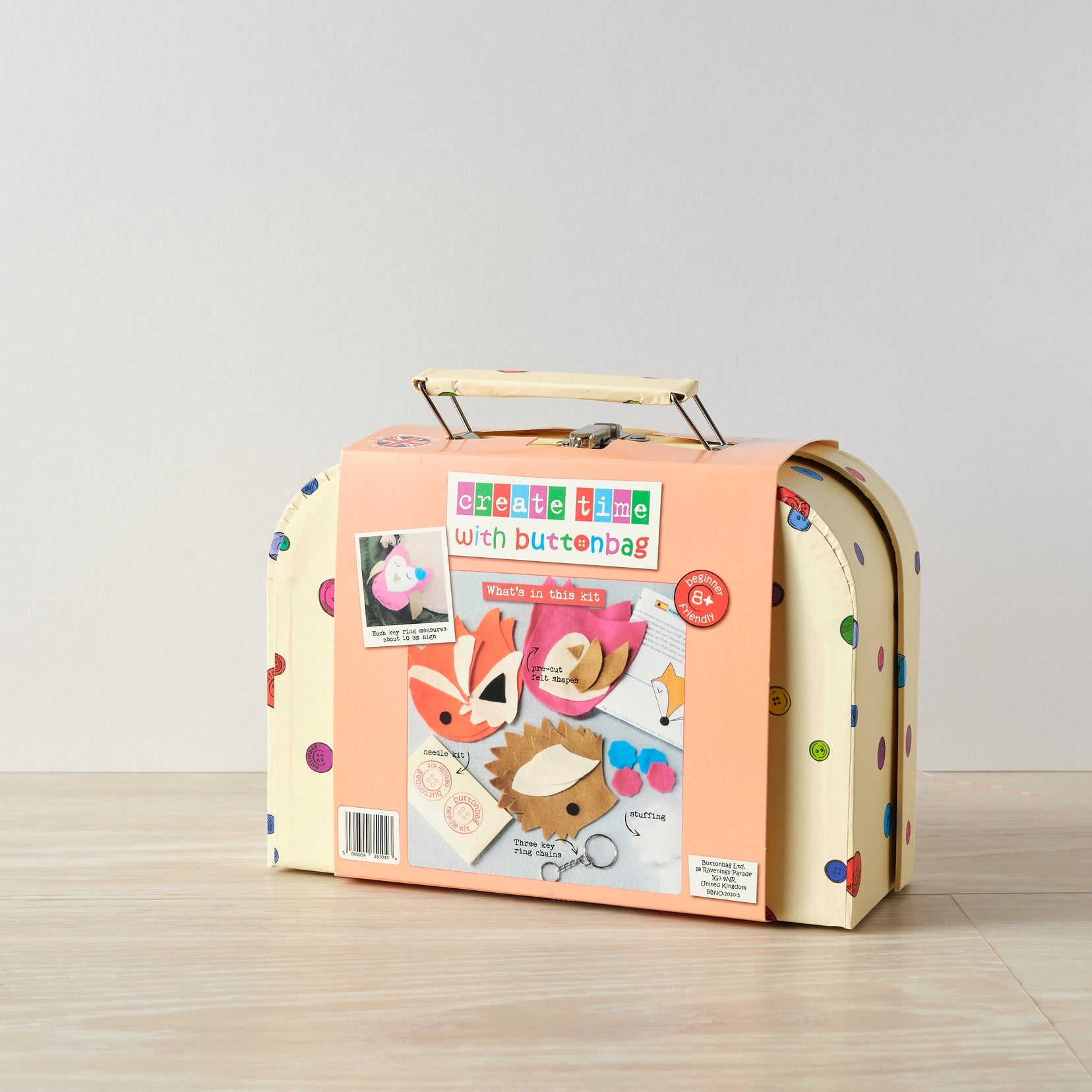 Make three little woodland friends out of pre-cut felt pieces, and keep them safe whilst you are making them in the little suitcase. You can get sewing straight away as the kit contains everything you need: felt shapes for a fox, a hedgehog and an owl, needle, thread, pins, stuffing and three key chains to hang them on. Perfect for making with friends.