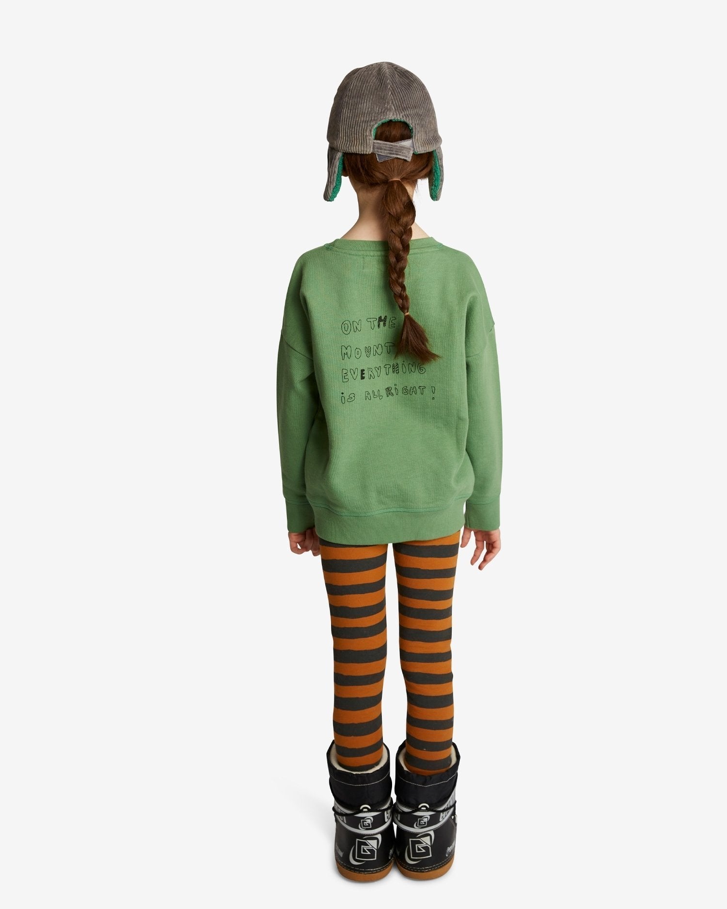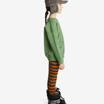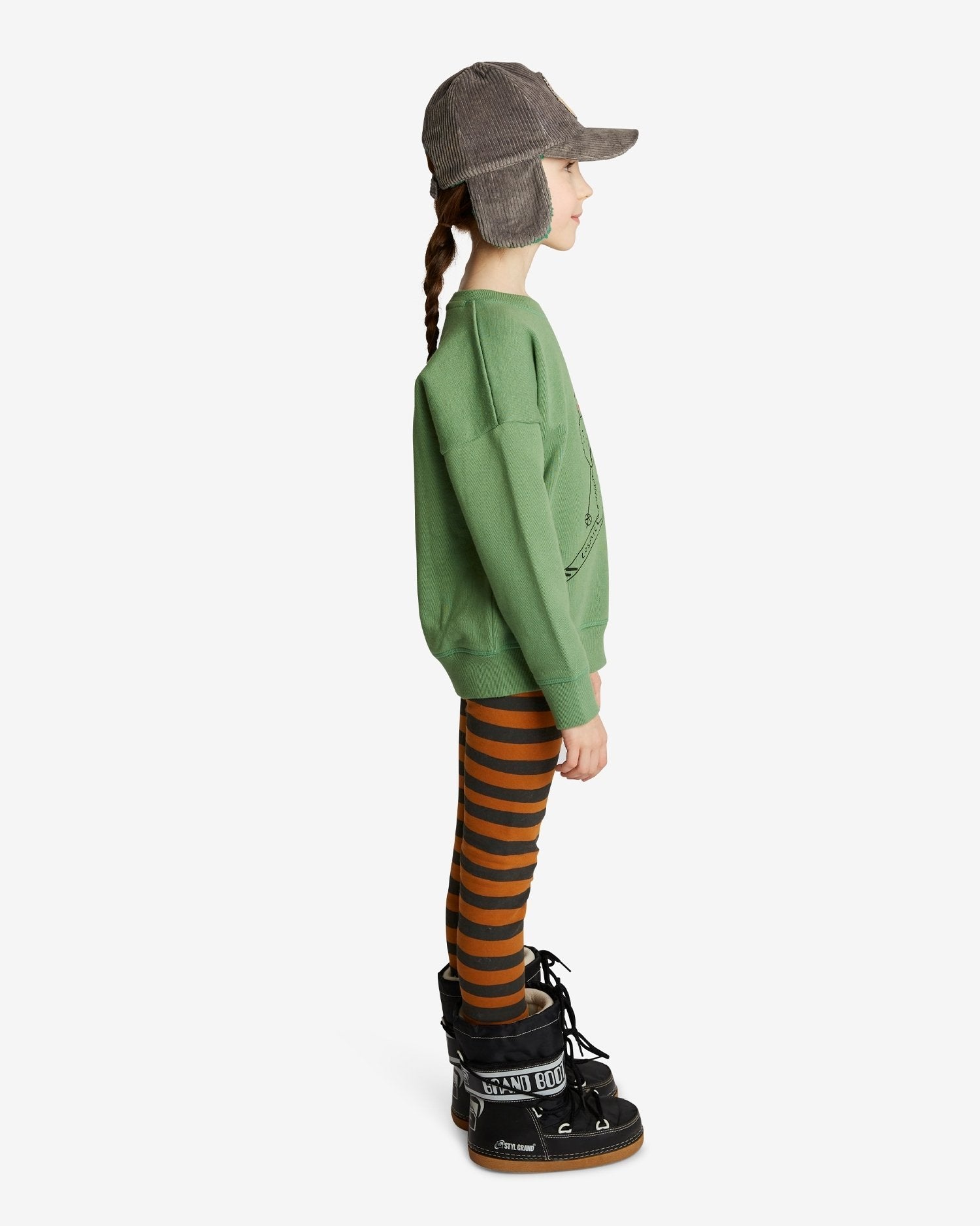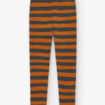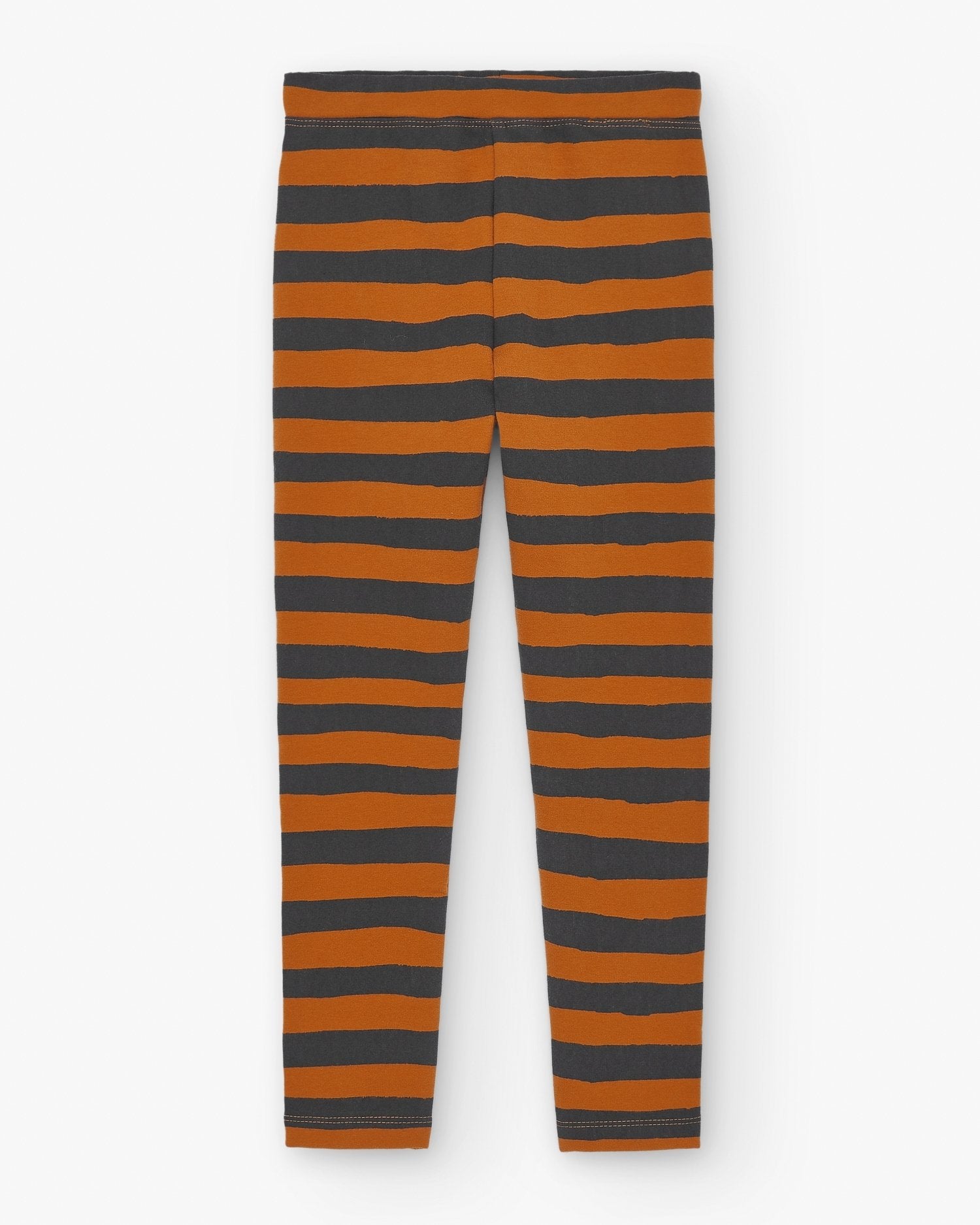 Dark brown organic cotton slim trousers for kids with an all over print of black stripes.