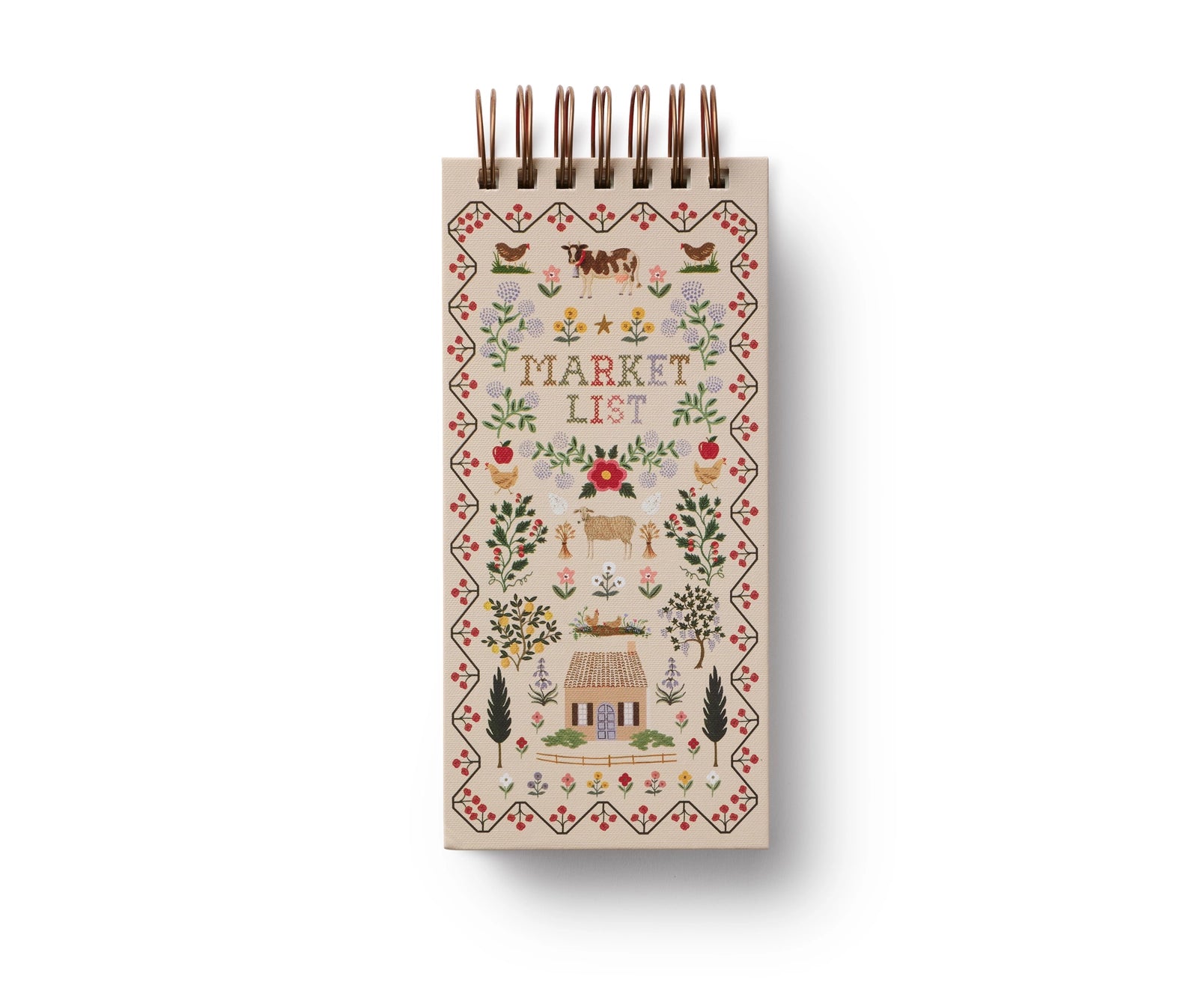 Organize your grocery list with this spiral-bound market pad, featuring 65 lined, perforated sheets and sweet, farmyard-inspired illustrations.
