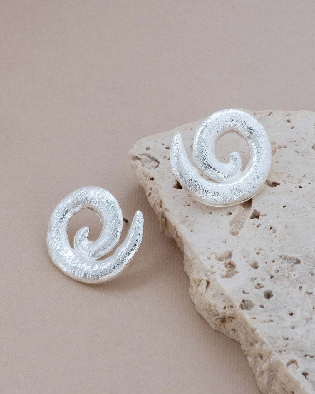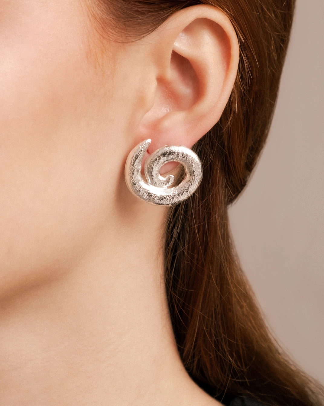 These silver spiral shaped earrings exude an understated elegance. Bold yet with a minimalist design and size, their textured finish gives them added depth and a touch of sophistication.