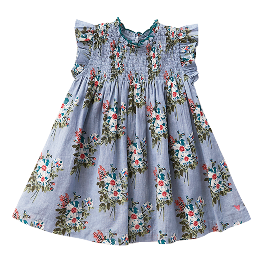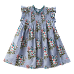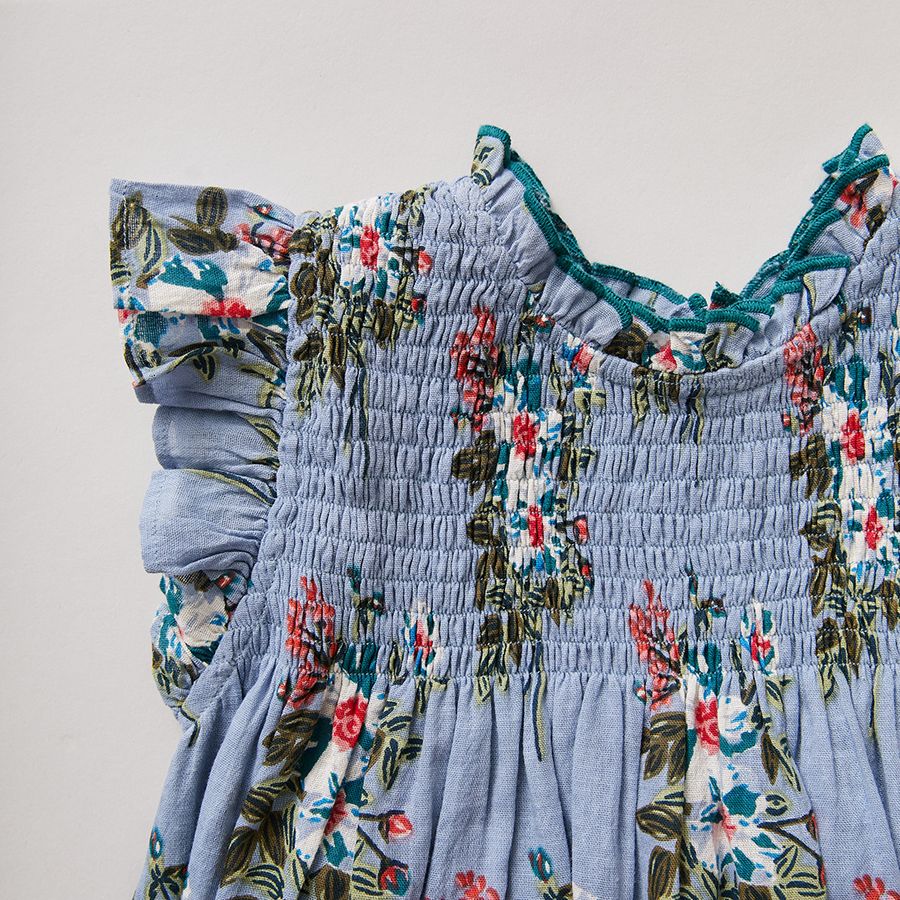 The Stevie Dress with cute, short ruffle sleeves and a smocked bodice is perfect for wearing right now and with a sweater in the colder months. The faded blue and vintage floral colors are especially sweet in this 100% cotton flat gauze piece. With a zipper back and adorable purl stitching around the scalloped neck, never has a Back to School outfit been so stylish and fuss-free! Match baby sister in her Stevie Dress Set.