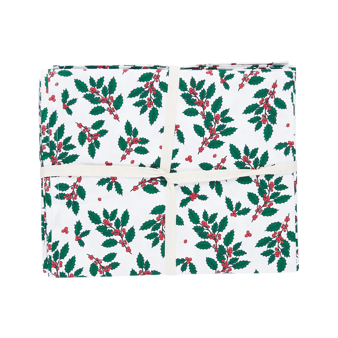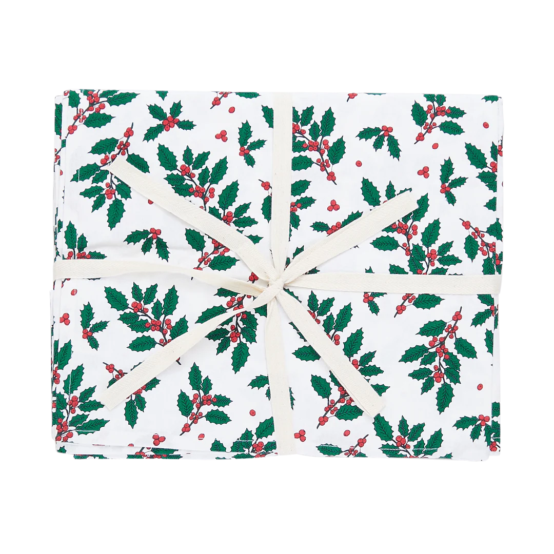 Timeless Table Toppers! A beautifully dressed table sets the stage for many a memorable family meal. Our gorgeous holiday tablecloths lay the foundation for what will surely be a favorite holiday moment. Available in a chicly traditional Holly print. Packaged with twill tape and measures 120"x60".