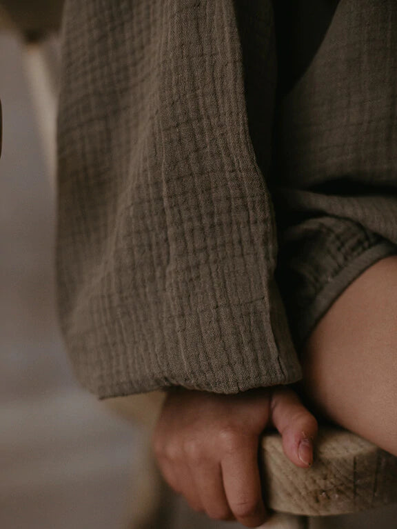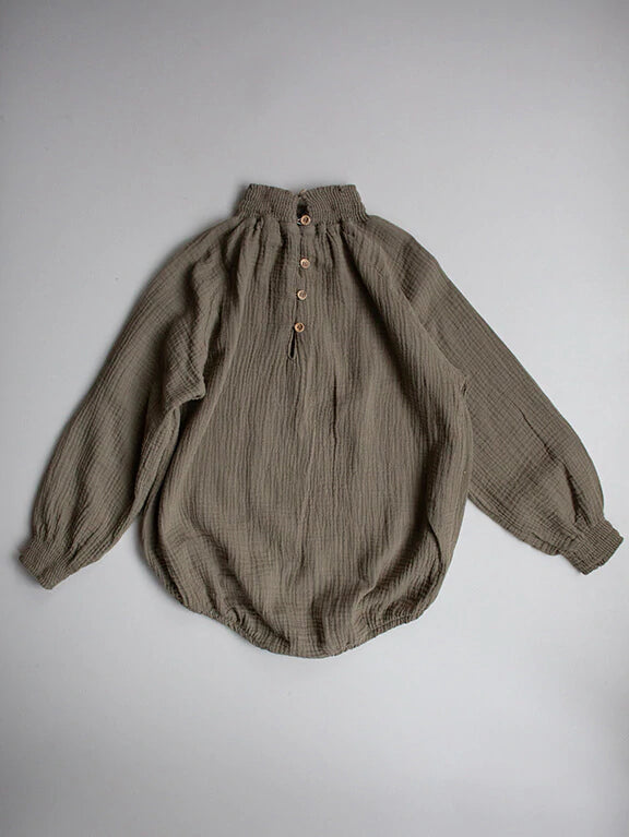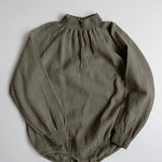 With a delicate high neck detail and soft, ballooned sleeves, The Muslin Bodysuit is beautifully made in our soft-to-the-touch, crinkly organic muslin. It is a gorgeous stand-alone piece and the perfect base layer for cooler days.