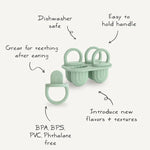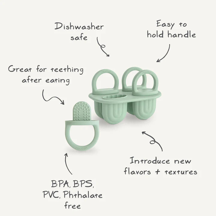 The food grade silicone tray is flexible, making it quick and easy to remove each pop. Littles can easily hold onto the small silicone handles and practice independent feeding.