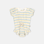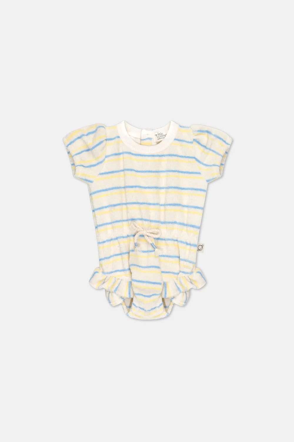 Striped, toweling romper with a round neck, short puff sleeves, and a button closure at the back and the gusset. Ruffle details at the leg holes and elastic waist with a decorative drawstring