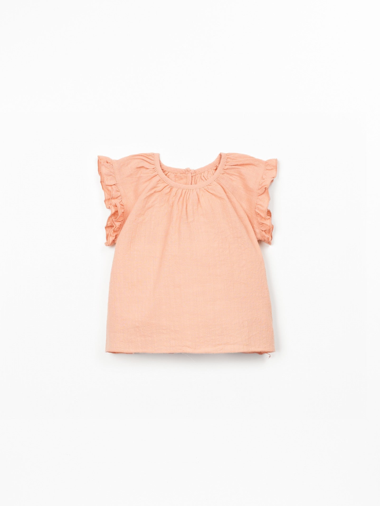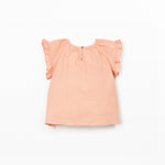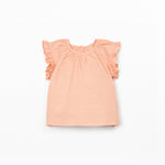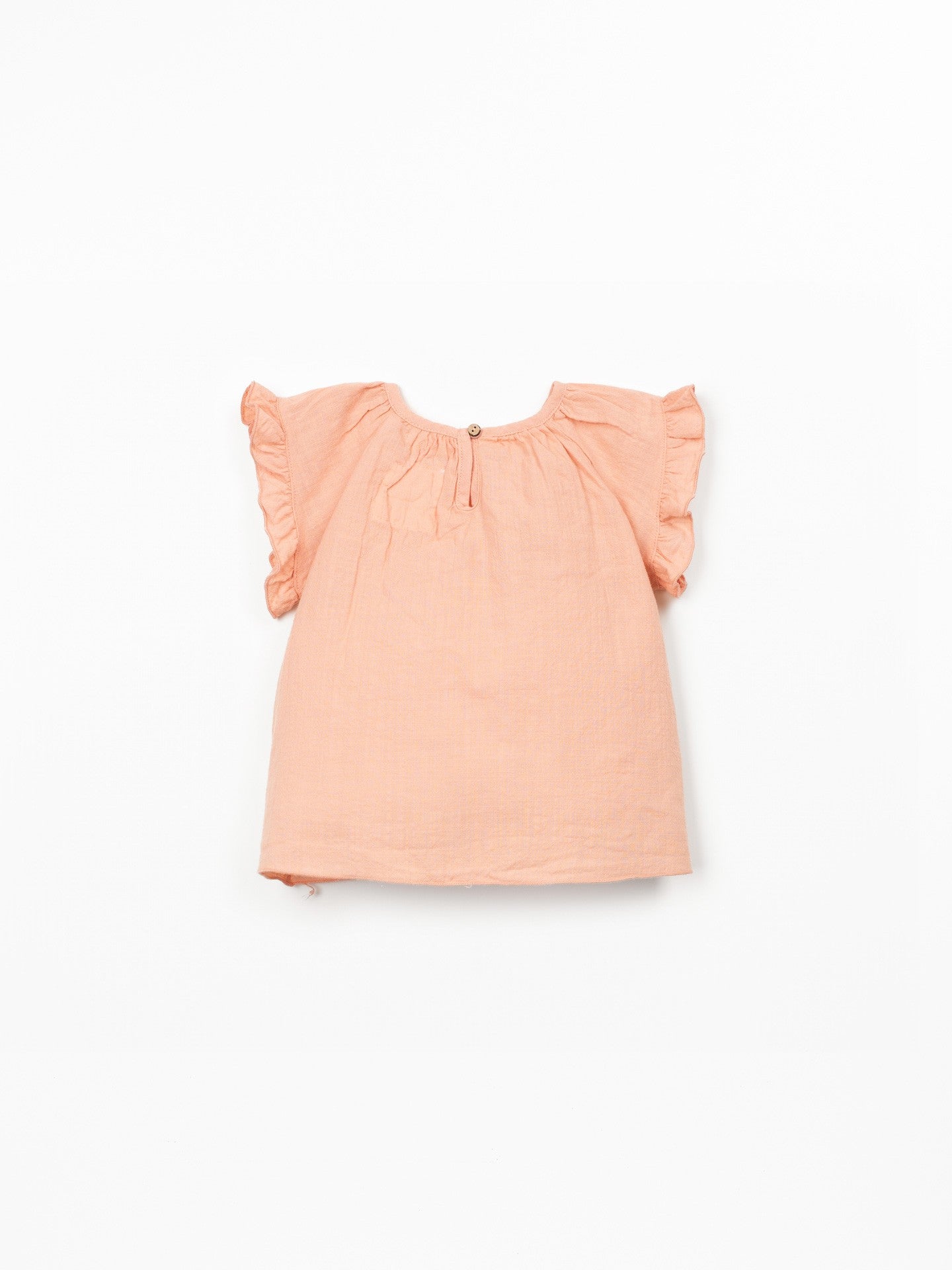 This tunic is made of organic cotton fabric in Salmon color. It features a round neckline, gathered sleeves, a back opening with a coconut button, and gathering on the chest.