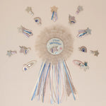 Finished with layers of chunky glitter and delicate satin ribbons in an array of rainbow colors.