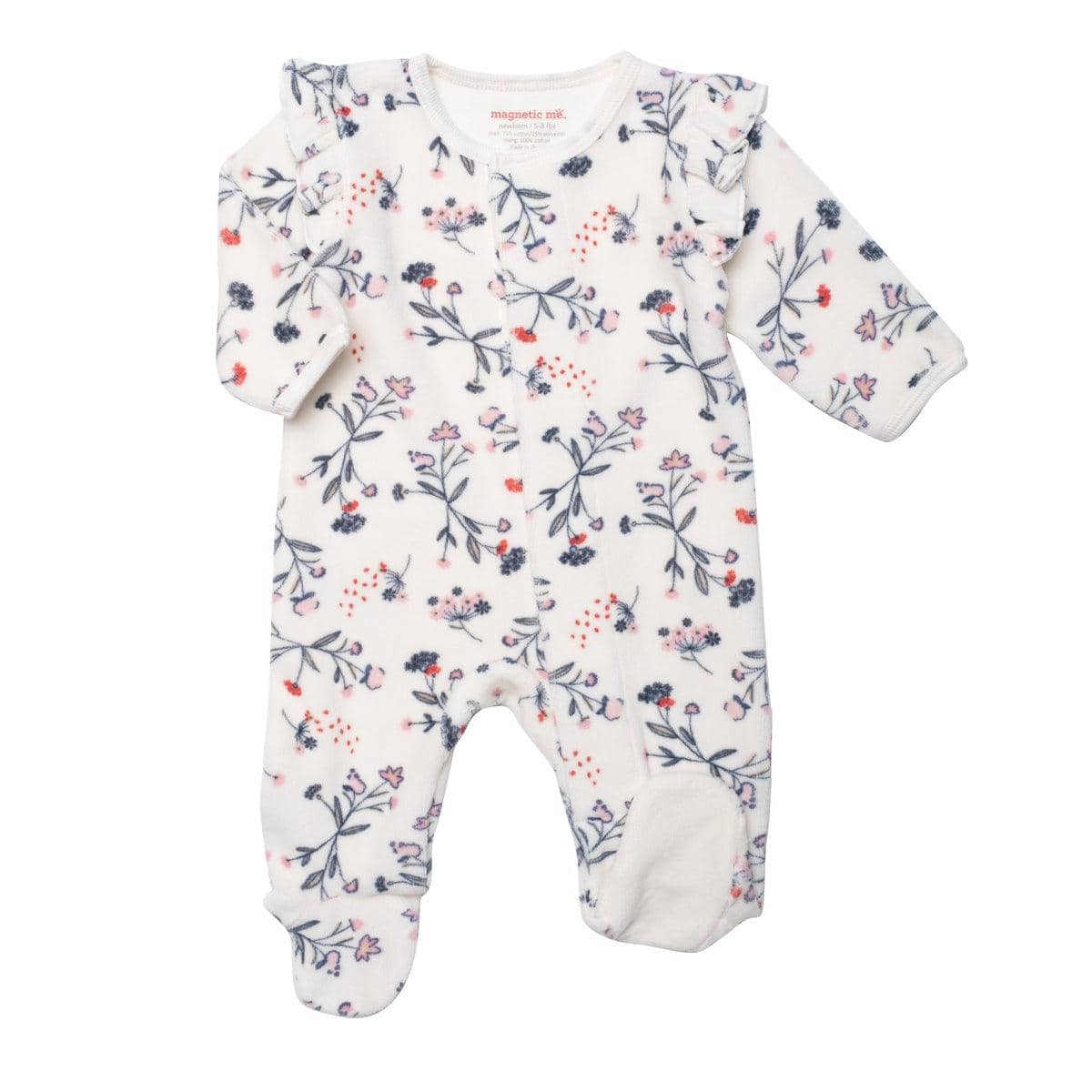 The velour parent favorite footie gets baby warmed up and dressed quickly with magnetic closures down the front. a little retro and very of the moment, it's the best outfit to wear when it gets chilly—it's soft, plush, and the perfect dose of cozy whether you’re at home or out and about.