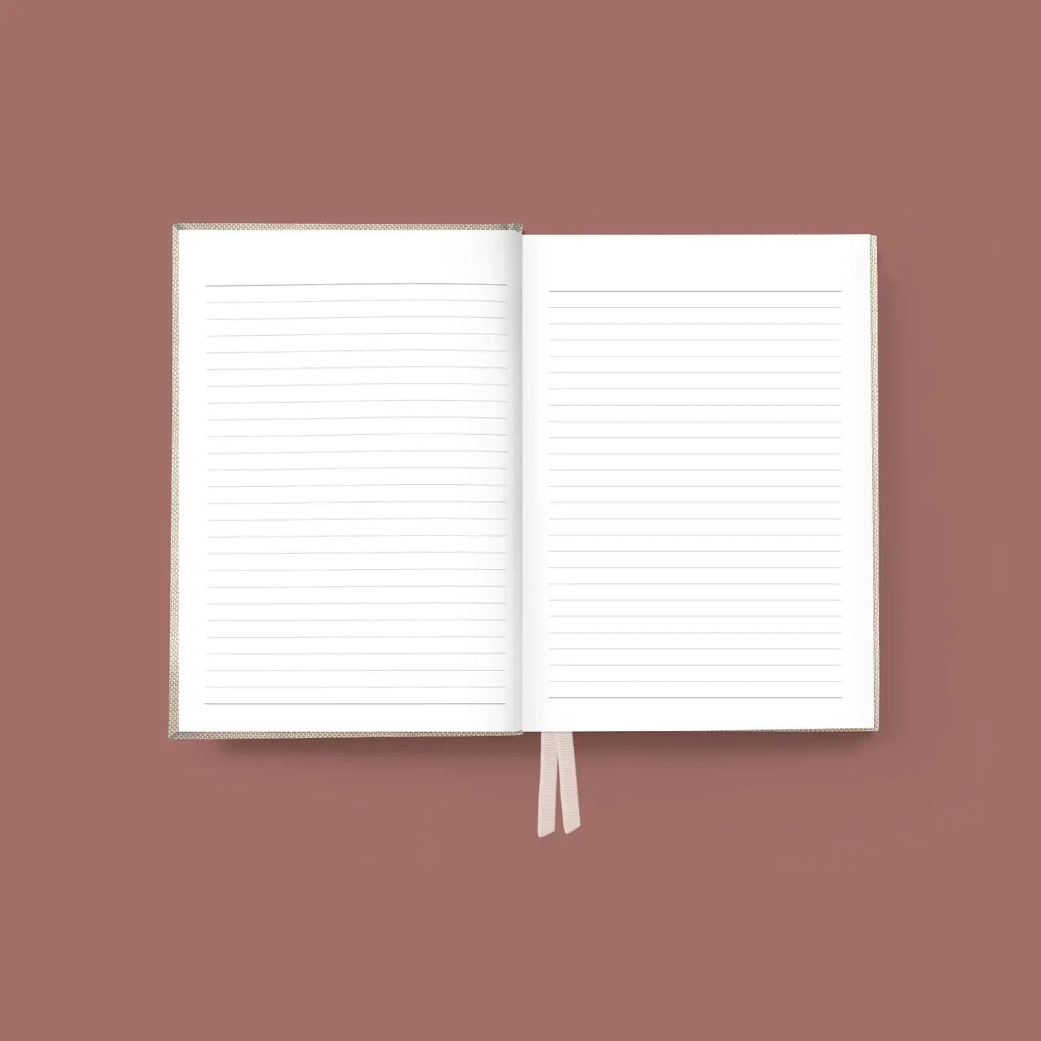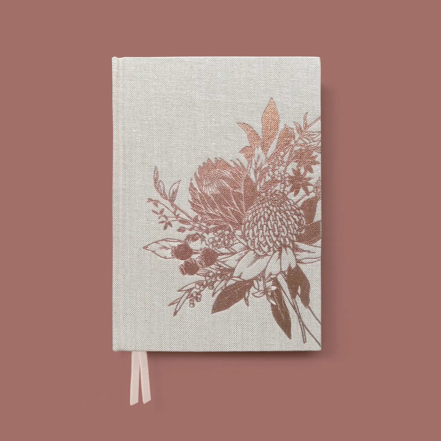 Linen bookcloth hardcover with printed floral design in rosegold foil.