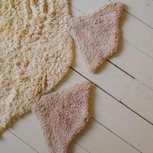 Shaped as a baby duck and tufted in soft yellow hues, combining short and high piles to illustrate the rounded shape of the animal. The Ducky animal rug has a rose-colored beak and paws with fluffy piles both on the front and the reverse side.