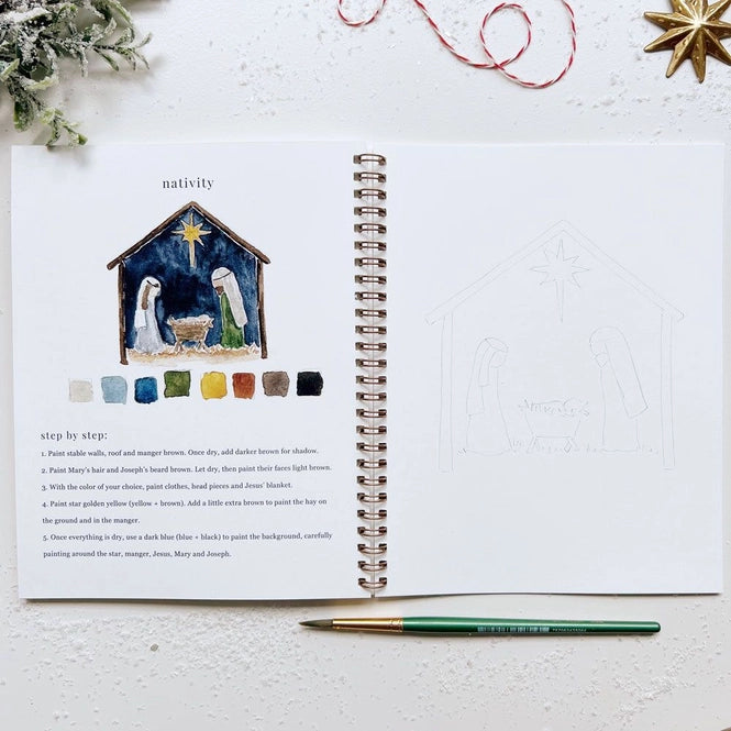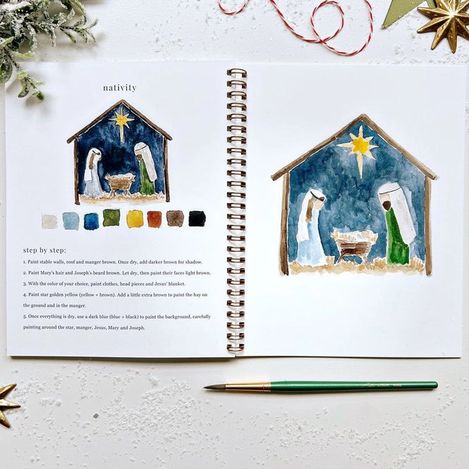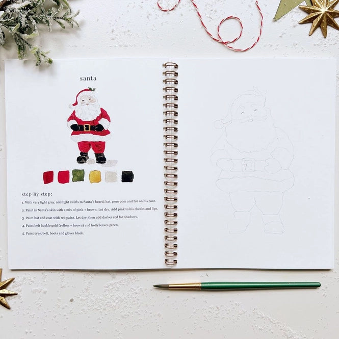 Included are 10 beginner-friendly sketches of Christmas favorites. There are examples to reference, simple instructions, and pre-printed sketches ready for you to paint directly on the page. Perfect for adults and kids!