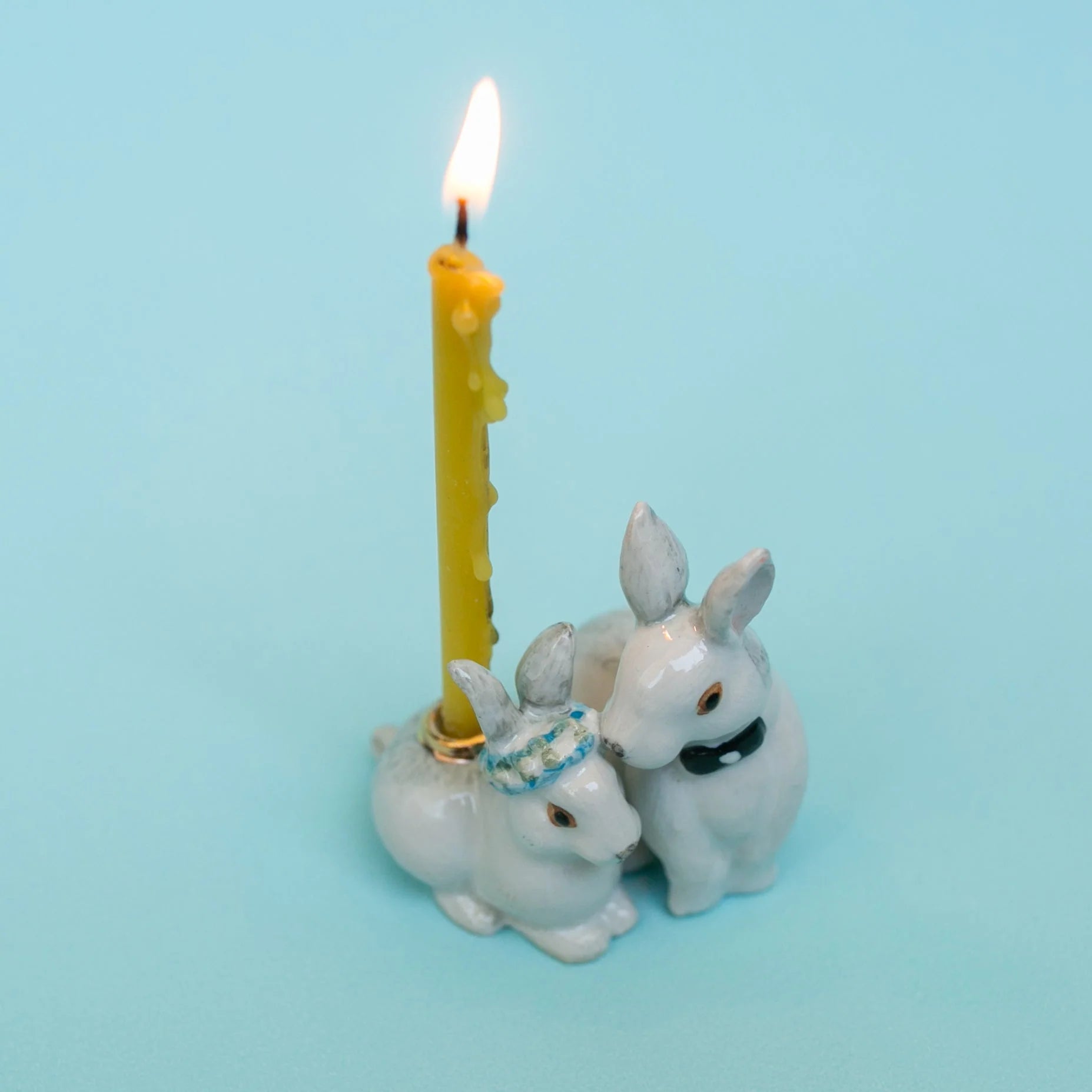 Handcrafted with care and attention to detail, each Love Bunnies topper is made from fine ceramic, meticulously hand-painted to bring out their charm and personality. The shared candleholder adds a meaningful touch, perfect for symbolizing the love and light you bring to each other’s lives.