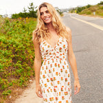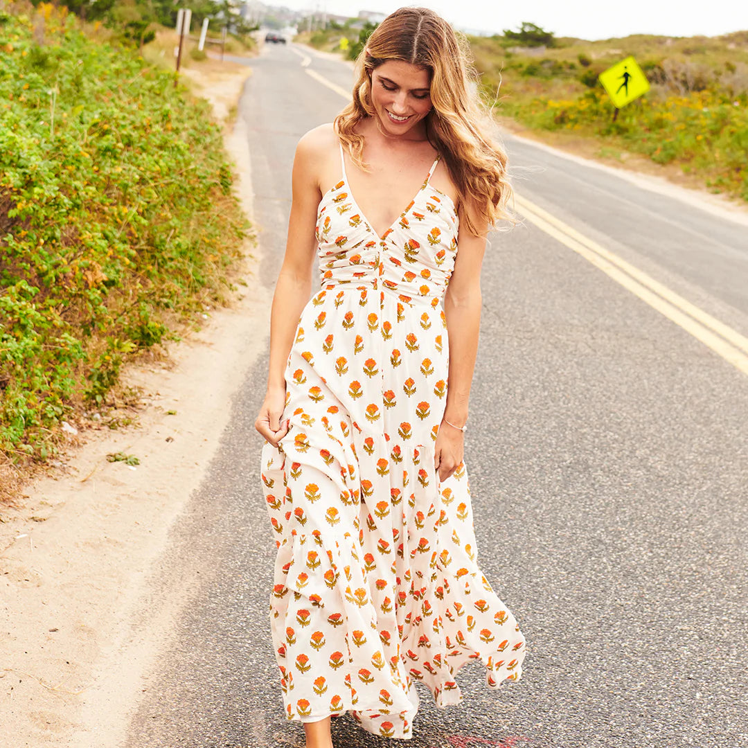 Mad For Marigolds! Our form flattering Women's Hope Dress brings out all the boho feels when crafted in our Small Orange Bud block print. A fresh bunch of gorgeous marigolds blooms on a crisp white ground on this free spirited tiered silhouette.