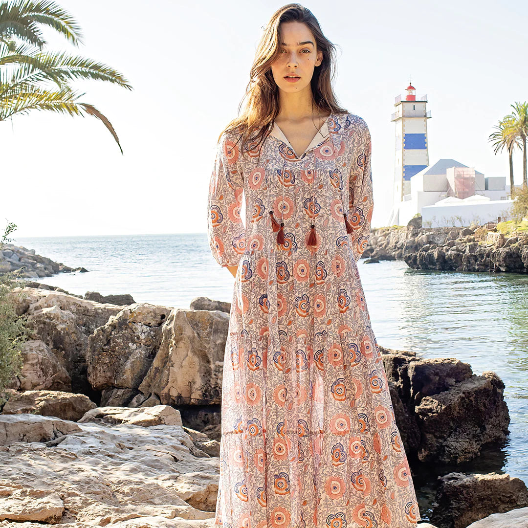 Pastel Perfection. Our dreamy Lisbon Floral, richly colored in dusty pinks and cool seaside blues, makes a sunny statement on our collection classic Womens Indira Dress. This fully lined, full length piece perfectly embodies our boho chic vibe. Works well with a sneaker for day and a leather boot for an evening out. Flattering for all women, including expectant mamas! Long sleeves and a double tassel tie at front are distinctive details.