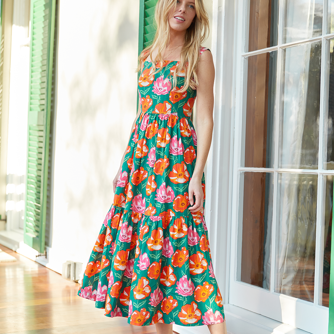 A classic sundress silhouette defines the Women's Sierra Dress, designed in crisp cotton poplin. Vivid floral motifs brighten the look as an eye-catching springtime statement.