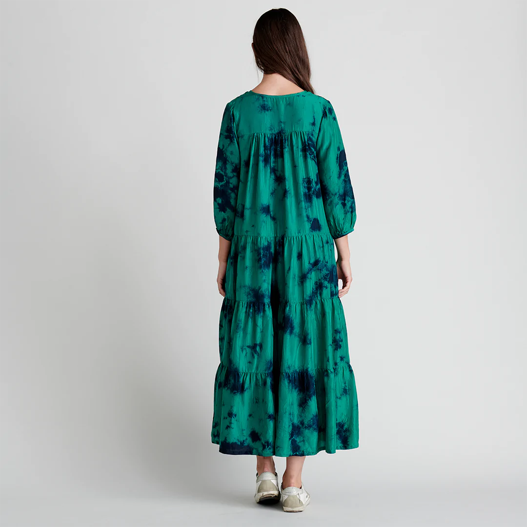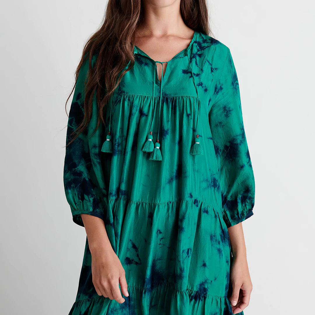 Navy and emerald, green hues blend beautifully in a tie-dye print on the Women's Silk Indira Dress. Together, the flowy tiered silhouette and tassel accents evoke an effortless sense of movement. With 3/4-length sleeves and a maxi silhouette, it features puffed sleeves as a feminine finishing touch.