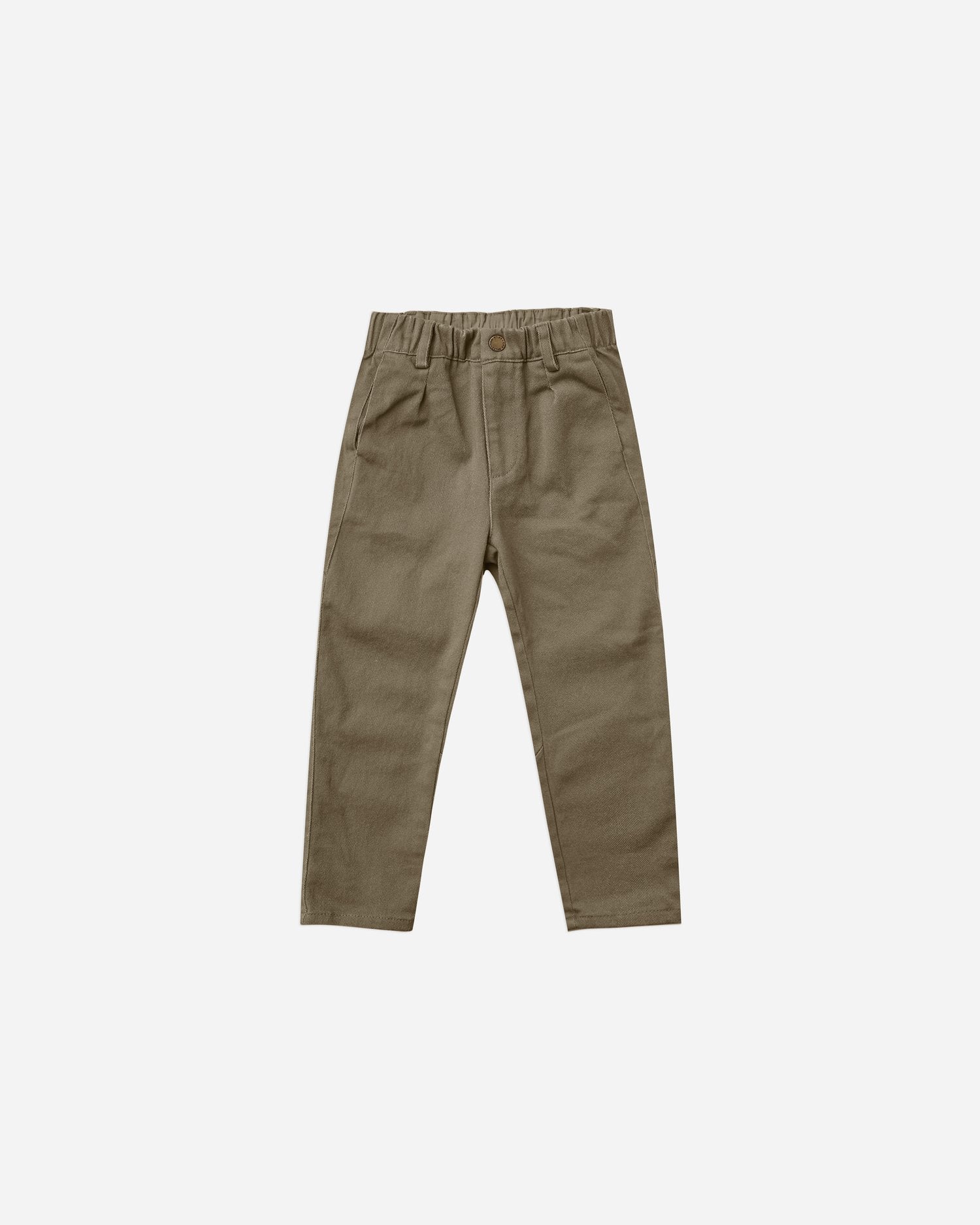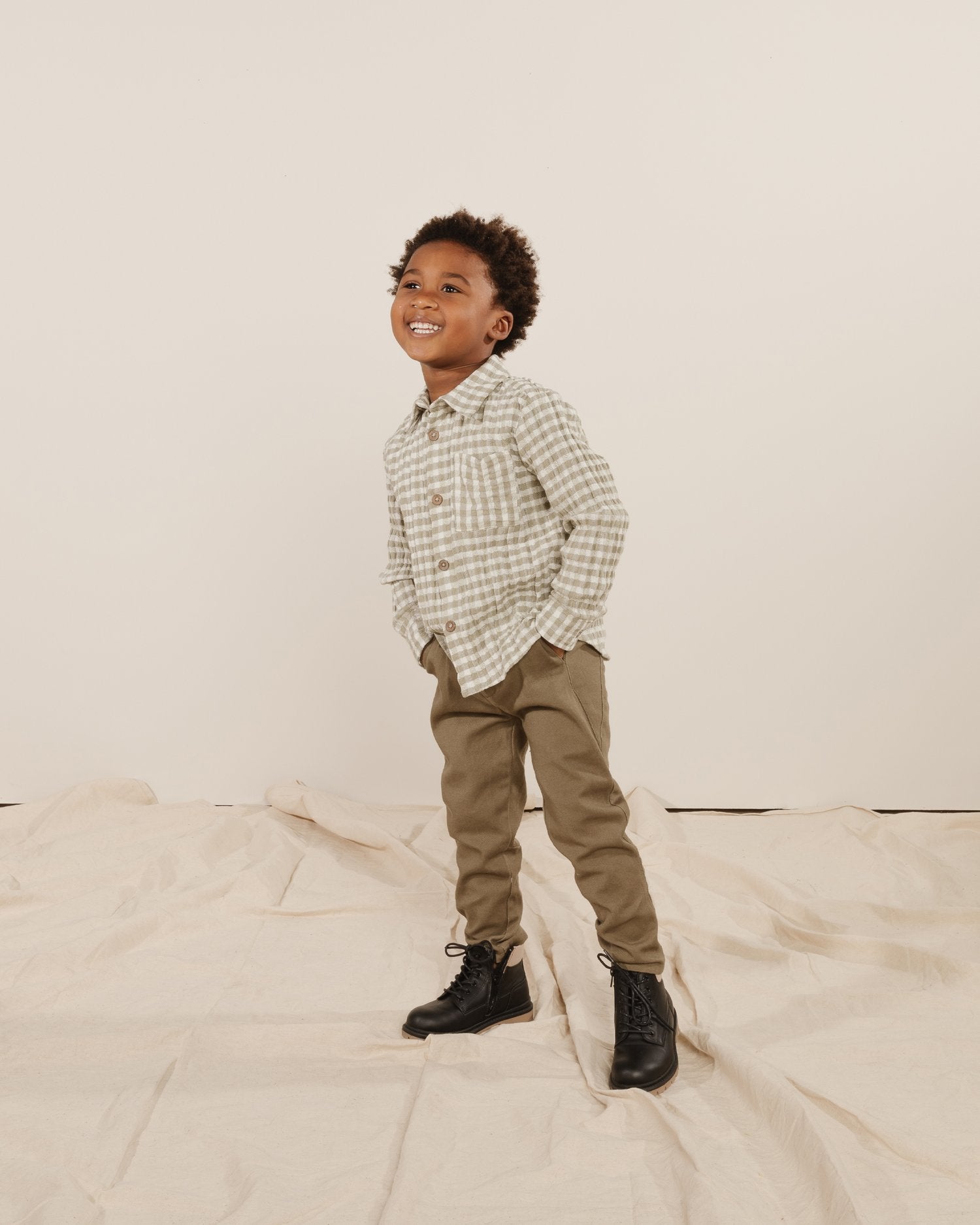Boys pant with elastic waistband and unique seaming detail. Featuring our favorite stretch twill fabric to help him move and play.